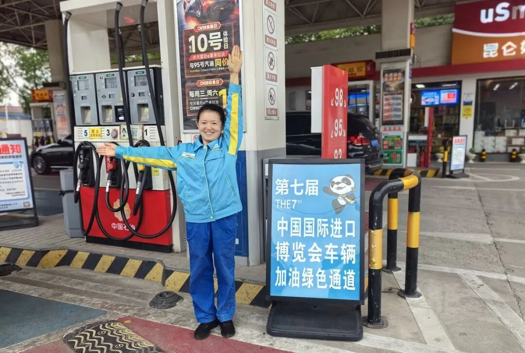 进博会前夕,中春路加油站成立“绿色进博保供队”,开设进博绿色加油通道,实现车辆全天候随到随加。加油员化身“蓝色小精灵”,提供饮用水、热饭、道路指引、歇脚休息、手机充电、应急医疗等便利服务,同时配备双语翻译人员服务外籍宾客,为参加进博会的国际展商、专业观众及八方宾客提供“so easy”一键式周到服务。