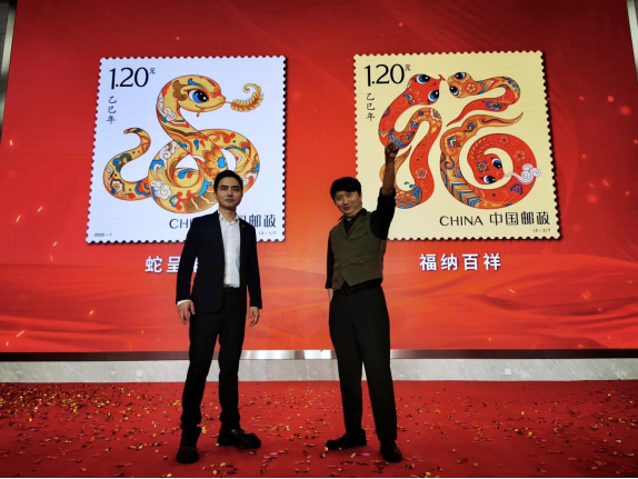 张旺(右)在蛇年邮票发布会上