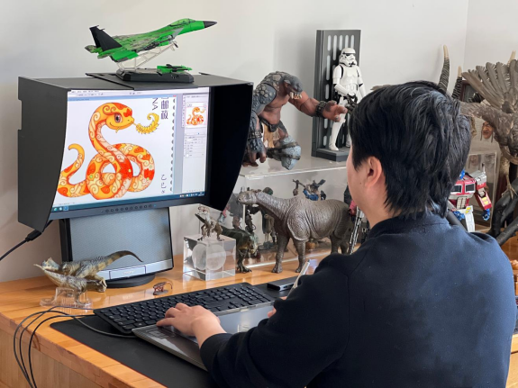 与常见的蛇的形象不同,张旺绘制的蛇圆圆的小脑袋上翘着萌萌的“猪鼻”。张旺说:“为了设计出兼具可爱特质与文化底蕴的形象,我多次去动物园、博物馆近距离观察各种蛇的姿态,同时查阅了大量文献资料。”在传统纹样中,人们常见盘绕的蛇身形象,张旺由此联想到数学的无穷符号,于是将之融入蛇形构图,辅以云纹、如意等纹饰,以此寓意新的一年“好运无穷”。