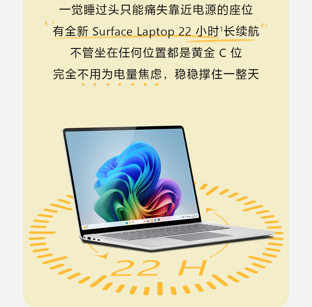 [1]测试为本地视频播放:微软于 2024 年 4 月使用预发布的软件和预生产的 Surface Laptop 骁龙® X Elite C12 512GB、16GB RAM 设备进行本地视频播放测试。测试包括在通过在 Windows Media Player 应用程序以 1080p、24 FPS 的速度播放 .mov 文件的视频,直至电池电量耗尽。除屏幕亮度设置为 150 尼特且禁用自动亮度外,所有设置均为默认设置。设备连接 Wi-Fi 。已使用 Windows 11 进行测试。电池使用时间因根据设备配置、使用情况、网络和功能配置、信号强度、设置及其他因素显著不同。