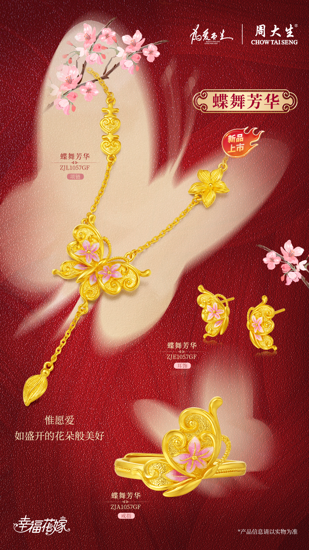 “梁祝化蝶双双飞,留给世人传奇美。”一提起蝴蝶,就会让人联想到梁山伯与祝英台的故事。在古诗词中蝴蝶亦常被用作象征爱情的元素,其轻盈、美丽的特质使得蝴蝶成为了忠贞爱情的代表。周大生幸福花嫁系列“蝶舞芳华”以蝴蝶与花朵的邂逅为灵感,并通过黄金珠宝的形式永久定格这份不期而遇的浪漫。此外,周大生精准捕捉自然界中蝴蝶轻盈、灵动的特点,通过细致的工艺巧妙还原其美丽翩飞之姿,赋予了产品蓬勃的生命力与活力。蝴蝶翅膀饰以渐变粉红珐琅点缀的花嫣草,呈现得更加美丽动人,也深刻诠释“除你之外别无他爱”的浪漫誓言。