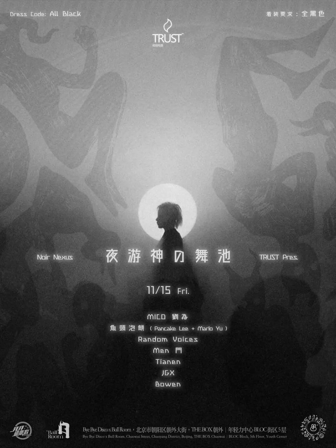 11 月 15 日 ( 周五 ) ,「TRUST」将在「ByeByeDisco x BallRoom」带领你步入这个神秘的舞池,与 “夜游神” 一同漫游黑夜的世界。我们都将化身暗夜精灵,以黑色为装扮,共同点亮夜的灵魂。