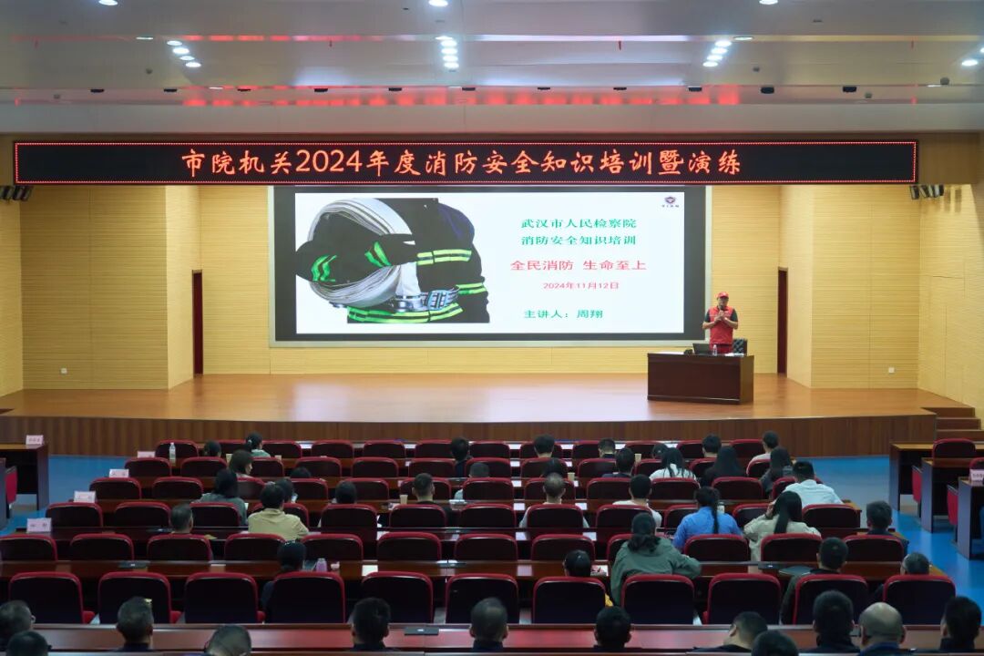 为进一步提高干警的消防安全意识和应急处置能力,加强机关安全保障工作,2024年11月12日,武汉市人民检察院开展了一场内容丰富的消防安全培训,该院全体干警、工作人员参训。武汉市江岸区消防救援大队的4名指战员受邀来到现场,对逃生疏散、火灾扑救等进行专业指导。