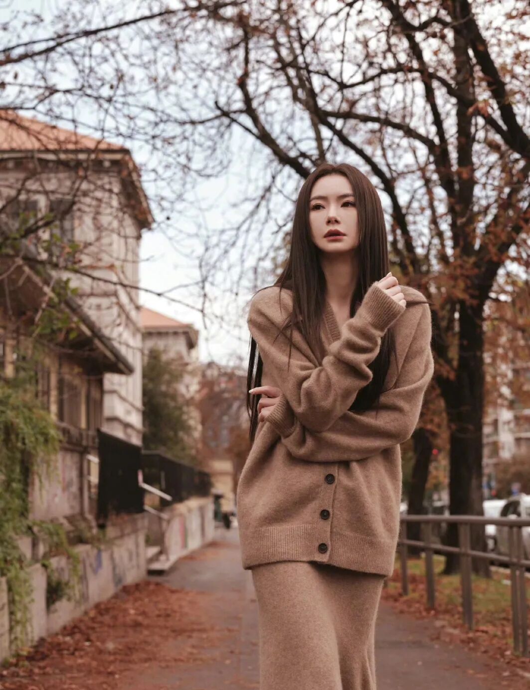 戚薇的驼色羊绒LOOK优雅得恰到好处,贴身的羊绒轻柔、自然,营造出慵懒松弛的秋冬格调。