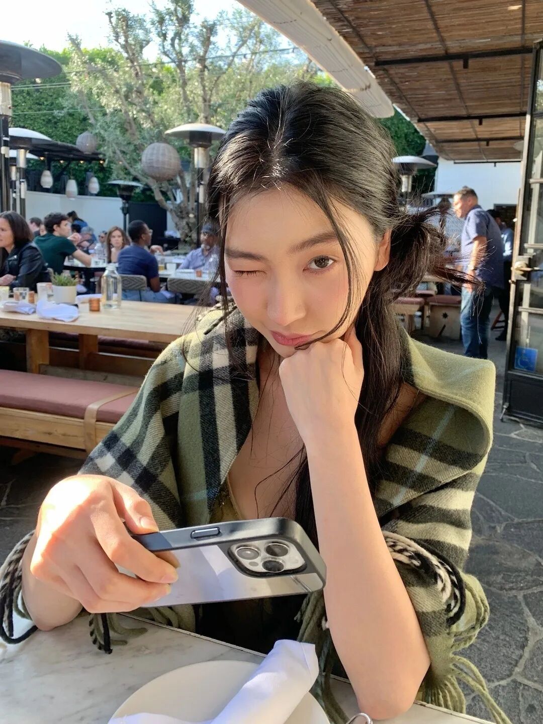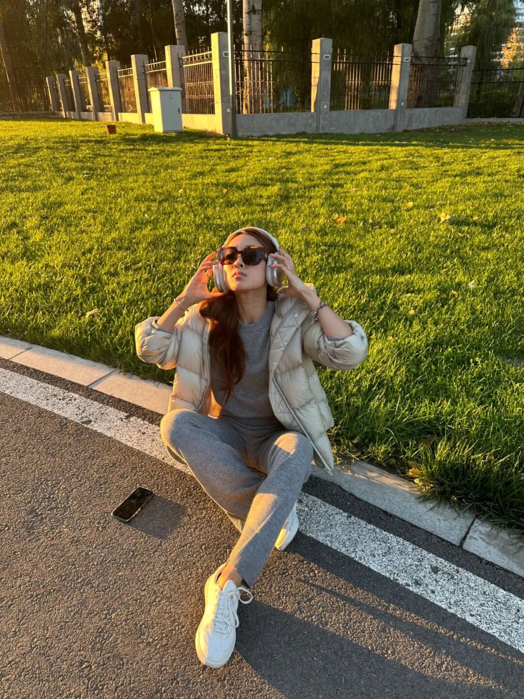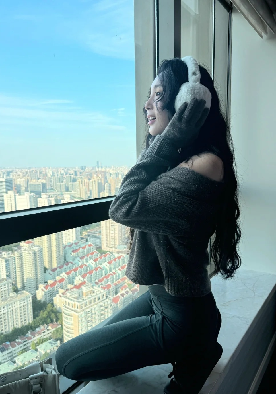 任俊霏则是将毛绒耳罩换成了头戴式耳机,短款羽绒服内搭的山羊绒系列精致且松软,低调又迷人。