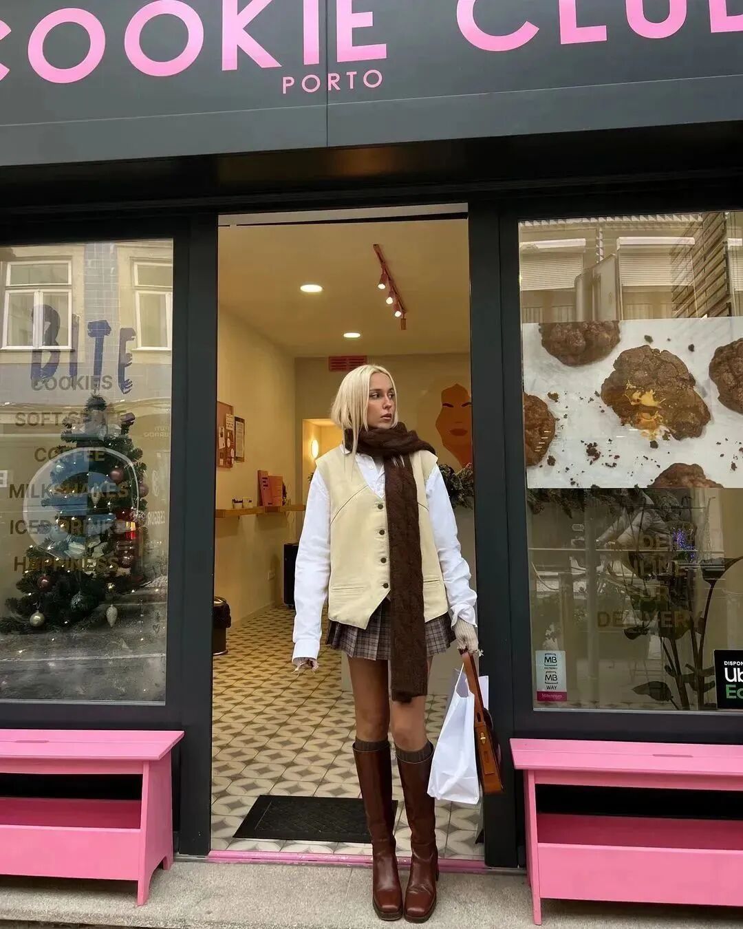 也可以玩转preppy style非正式学院风,在凛冬也能洋溢着满满的青春热情。