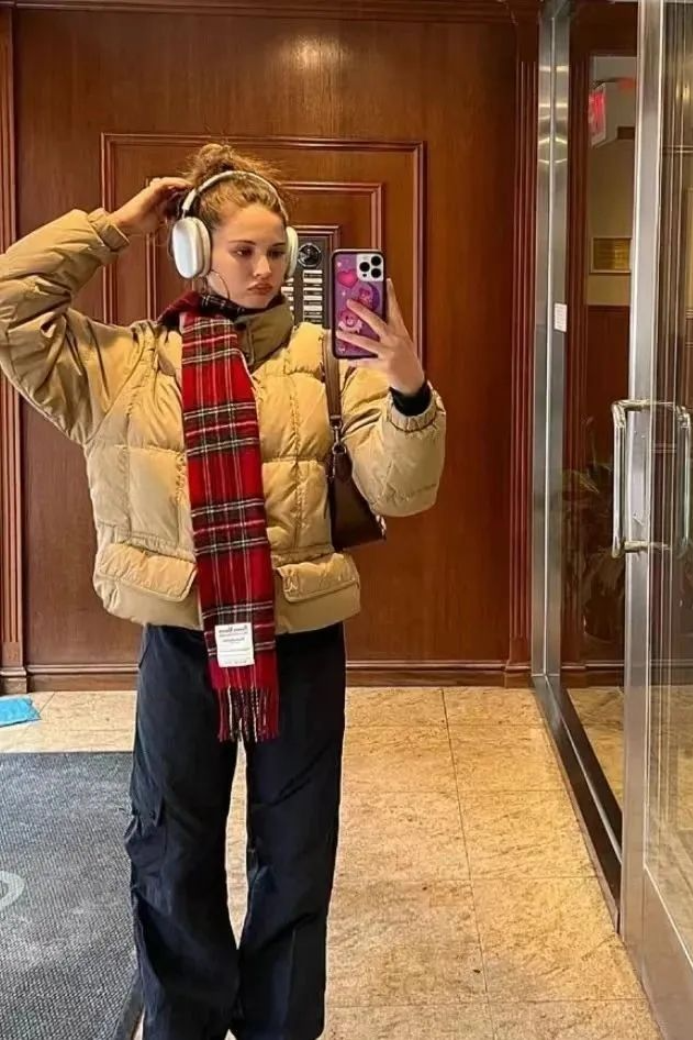 等到天气凉一些,还可以搭一件短款羽绒服,更有时髦层次感,保暖之余又足够轻便。