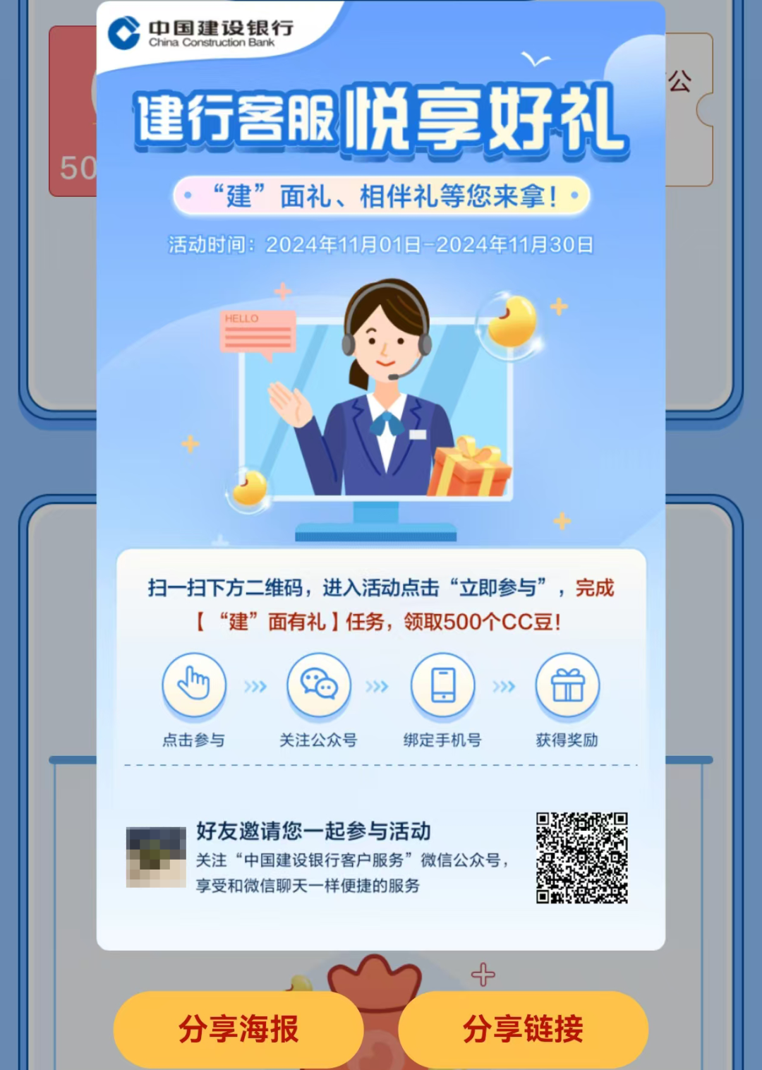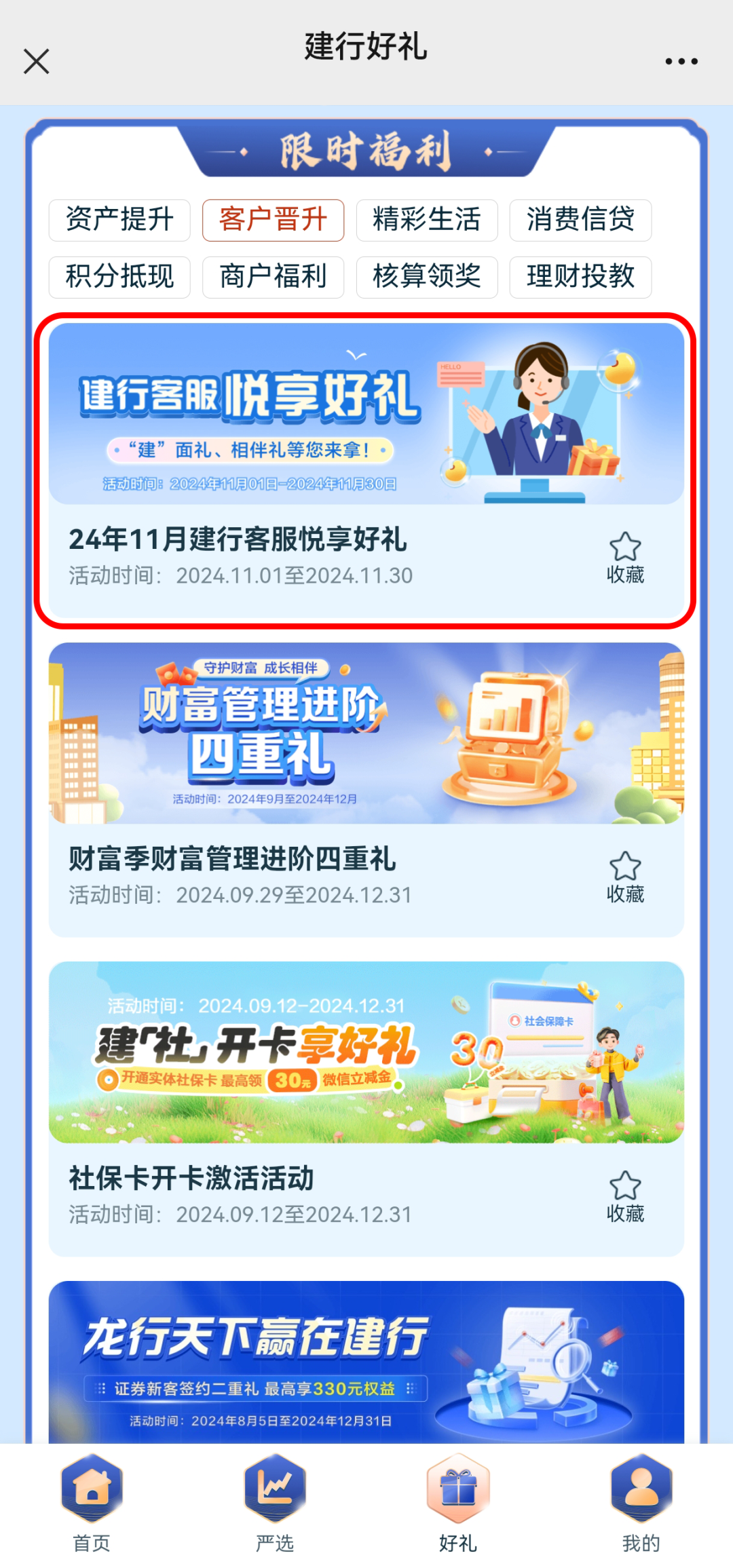 注:您还可通过“中国建设银行”APP、“建行生活”APP,进入“财富季”主会场,点击“好礼-客户晋升-建行客服 悦享好礼”参与活动。