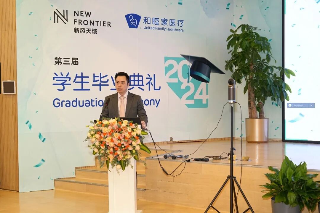 新风天域联合创始人兼首席执行官、和睦家医疗首席执行官吴启楠先生向即将毕业的同学们致以热烈的祝贺,并向所有辛勤付出的老师们表示诚挚的感谢。他希望同学们保持对医学新技术的开放态度,秉持终身学习的精神,同时始终怀着对患者的同理心,坚持高标准的医疗服务,做到 "Do well and do good",为患者和社区做出卓越贡献。