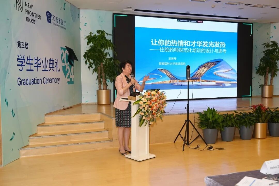 毕业典礼特别邀请了首都医科大学药学院临床药学系副主任王育琴教授进行了主题为“让你的热情和才华发光发热——住院药师规范化培训的设计与思考”的主旨演讲,向现场的同学和老师们介绍了国内外临床医学人才培养现状以及继续医学教育的重要性。