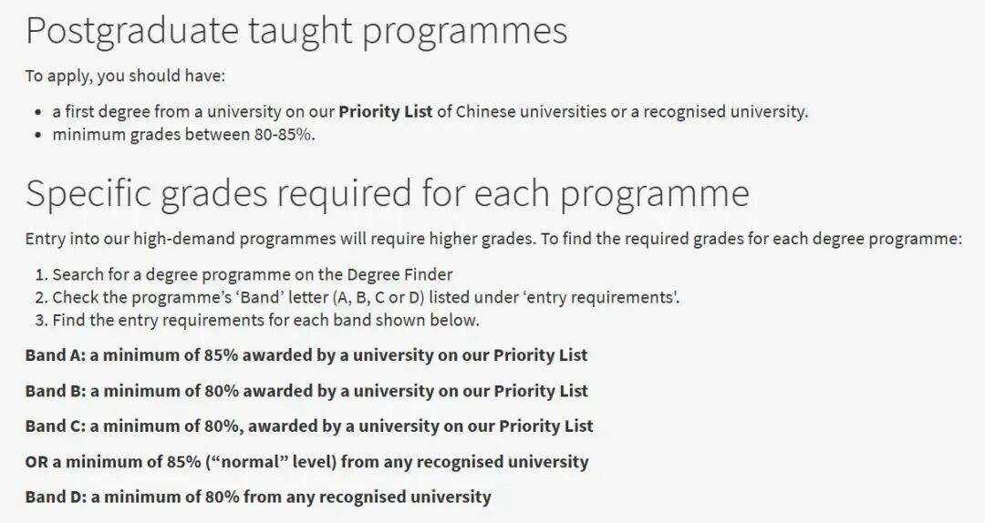 Band C:要求Priority List中的大学均分需要达到80%;或非要求Priority List中的大学均分需要达到85%