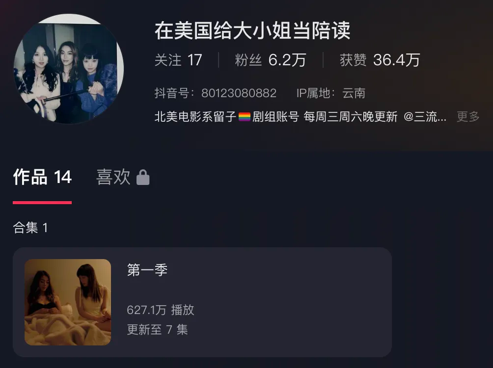 6月中旬,就读于爱默生学院的留学生导演Aces和制片人Isabel,在抖音上线了其原创网络短剧《在美国给大小姐当陪读》,目前已在全网获千万播放量,单条视频平均点赞过万,堪称今夏最热的留学生短剧。