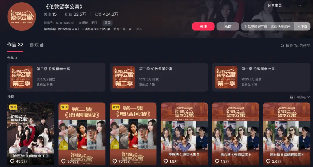 2024年1月,短剧《伦敦留学公寓》第一集发布在抖音上,立即登上热榜第一,整部剧集全网累计播放量超过1.5亿。