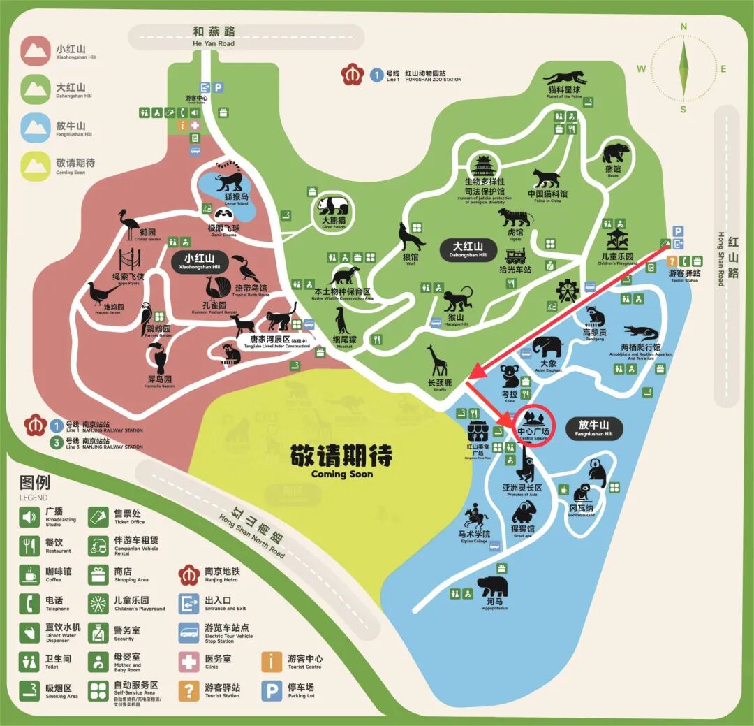 从红山动物园东门入口进入 向考拉馆方向走到中心广场 就可以看到我们的「返航新生」接头点