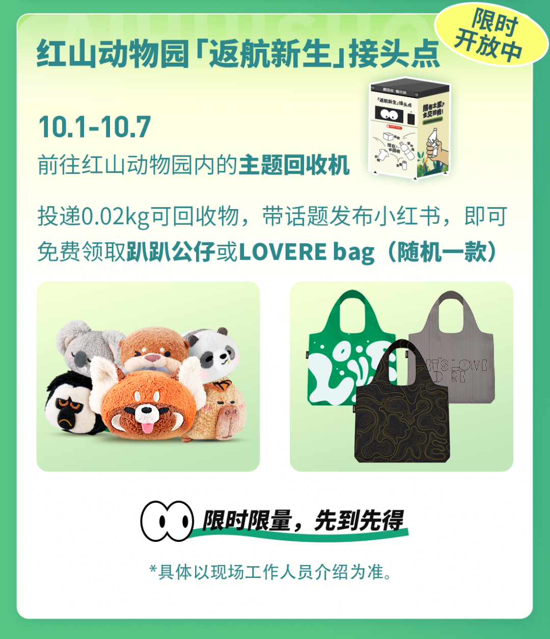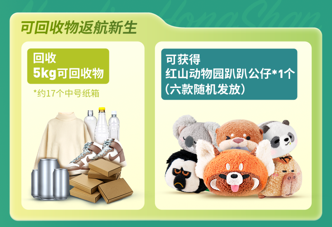 带几瓶矿泉水逛红山动物园 只需投递0.02kg可回收物 约等于两个塑料瓶哦 (废纸、塑料、金属、织物都可以收哦~) 投递后按要求发布小红书 就可免费领趴趴公仔或LOVERE环保袋