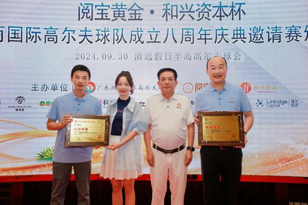 广东潮商国际高尔夫球队林喜七队长、广东省潮商会邱慕玲秘书长为阅宝黄金、和兴资本颁发冠名赞助牌匾。
