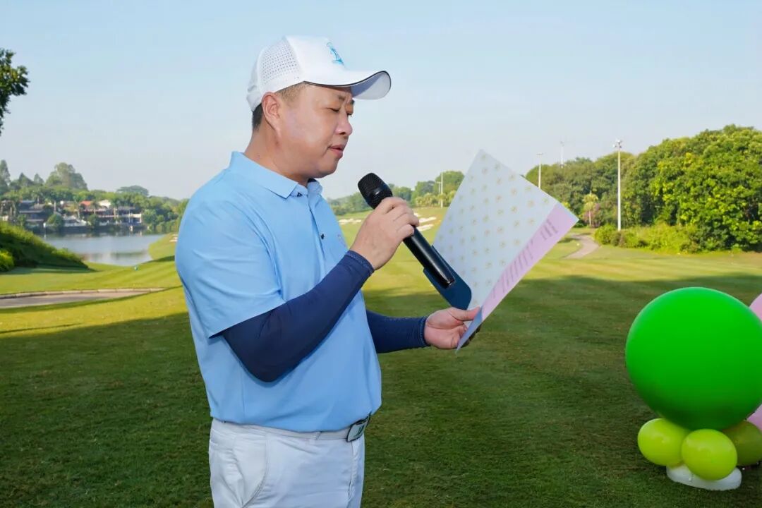 广东潮商国际高尔夫球队副队长林钟龙在开球仪式上为参赛嘉宾介绍“阅宝黄金·和兴资本杯”广东潮商国际高尔夫球队成立八周年庆典邀请赛赛事规则、赛制,并祝愿所有参赛队员及嘉宾发挥超常状态,赛出水平,载誉而归!