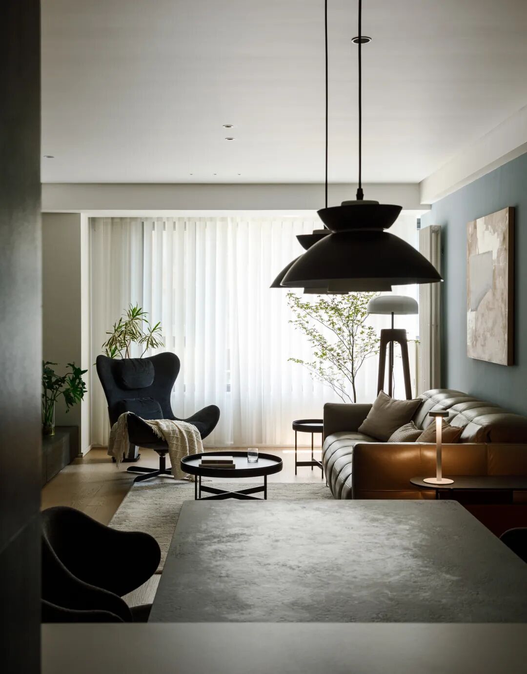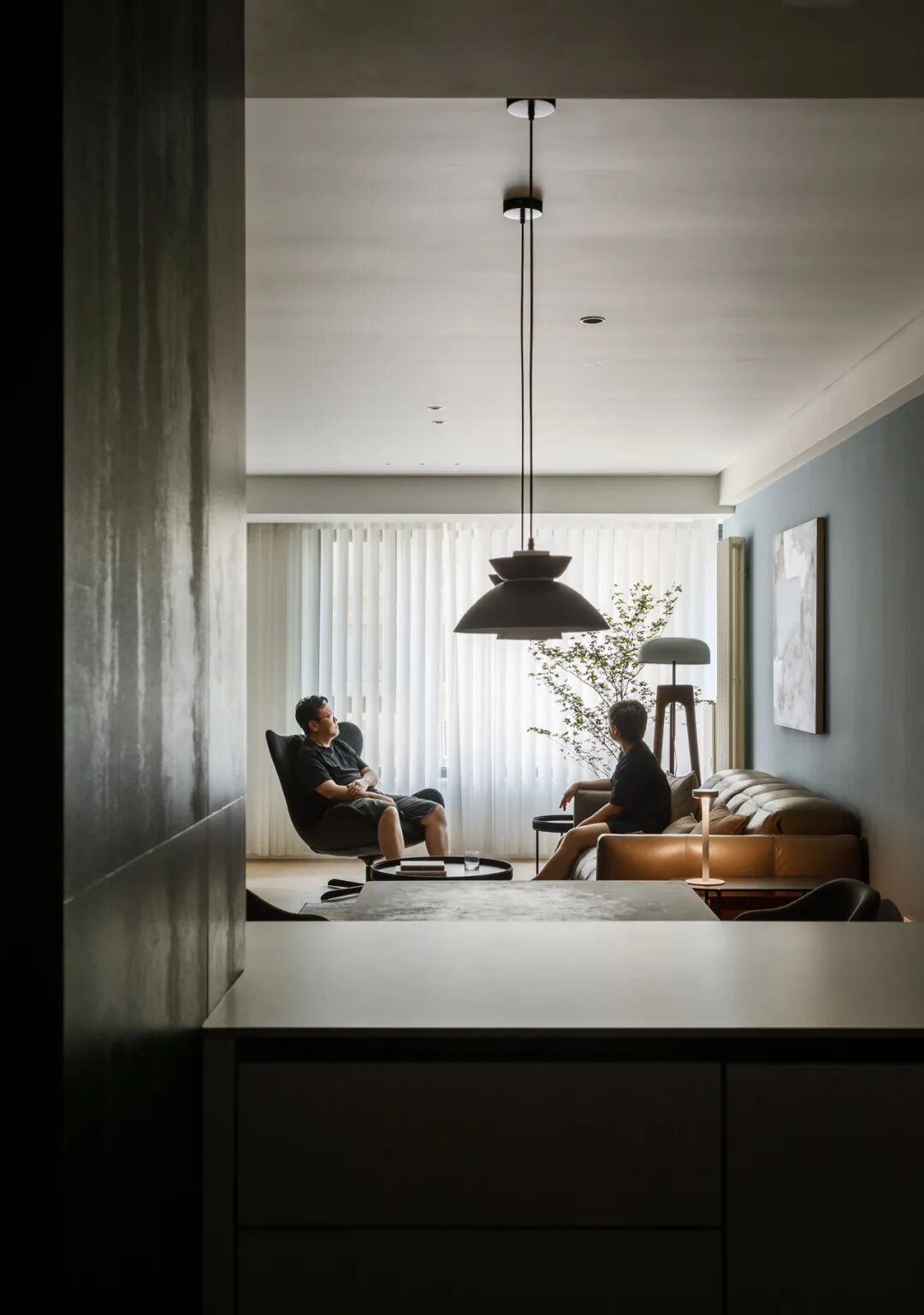客厅小巧紧凑,“一张地毯可覆盖”:选的双人位皮质沙发、一把灵活的座椅、两张暗色小圆几...是有意追求包裹感。在沙发背墙涂刷了雾蓝色;电视背墙则用的灰色水泥岩板...蓝调时刻般的氛围,很容易滋生温暖与治愈。