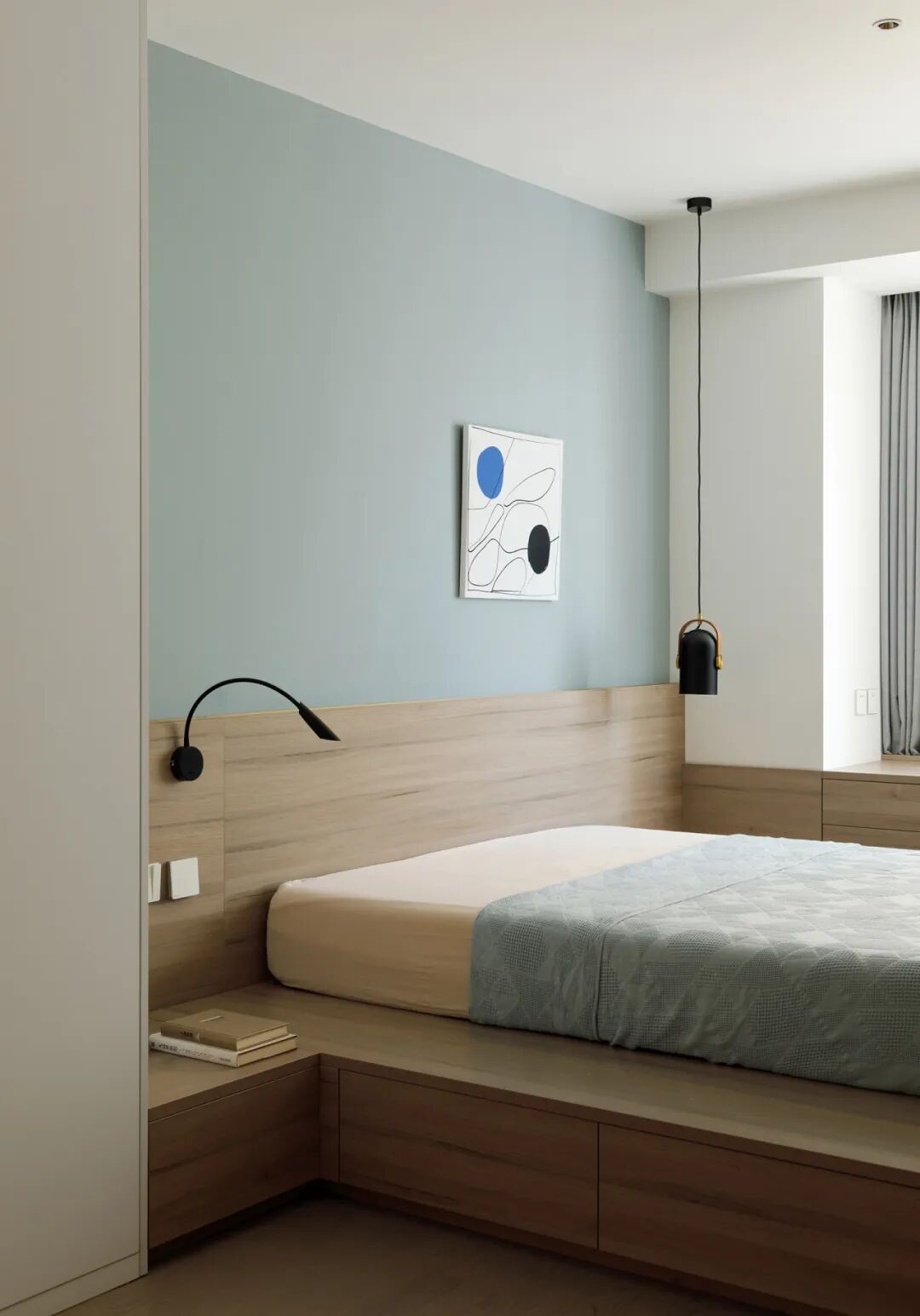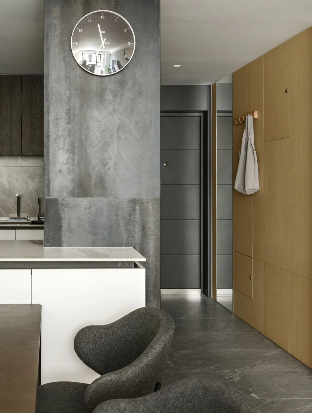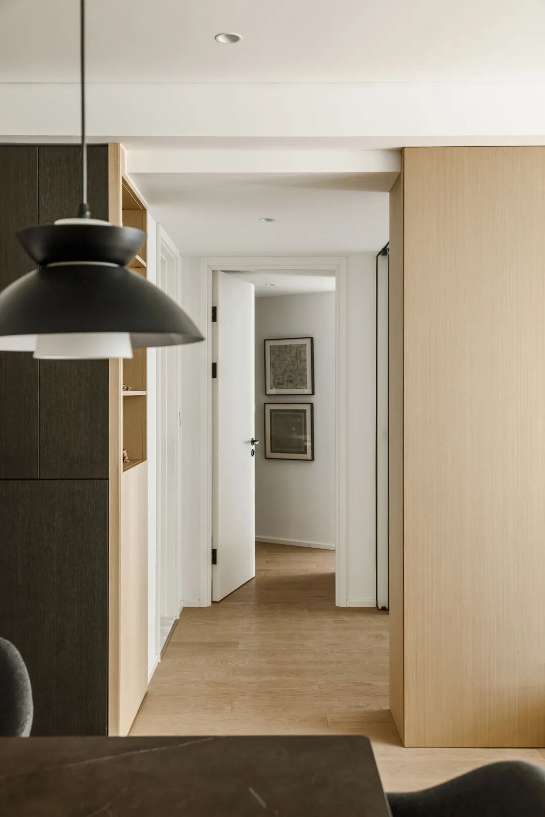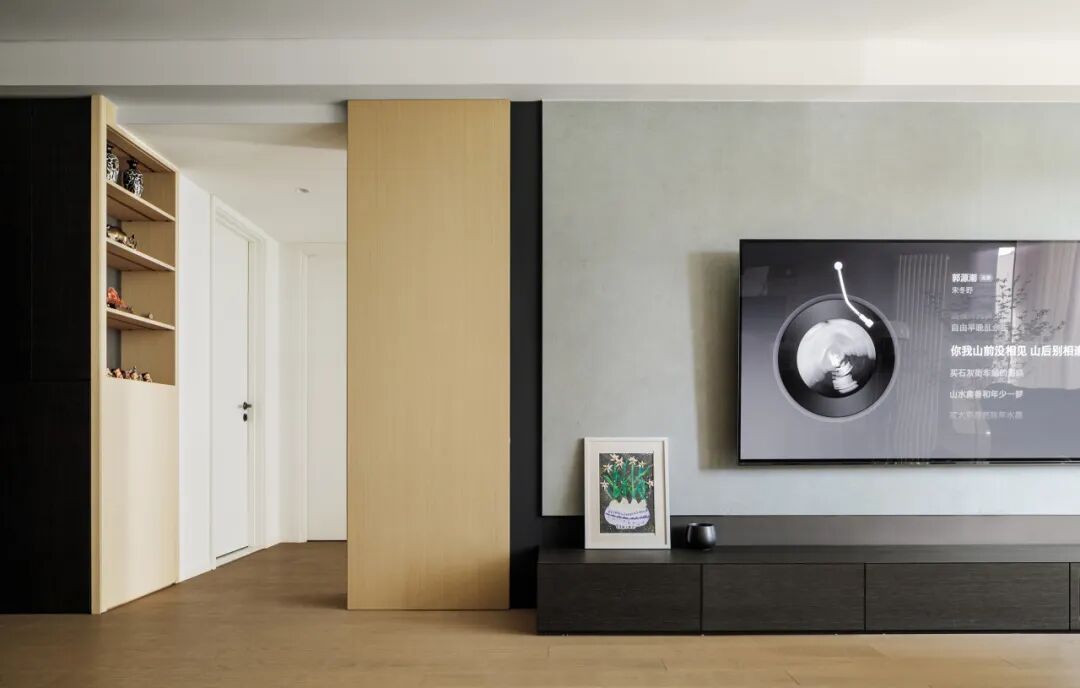 △ 铺贴木色墙板,隐藏强弱电箱,给予松弛感