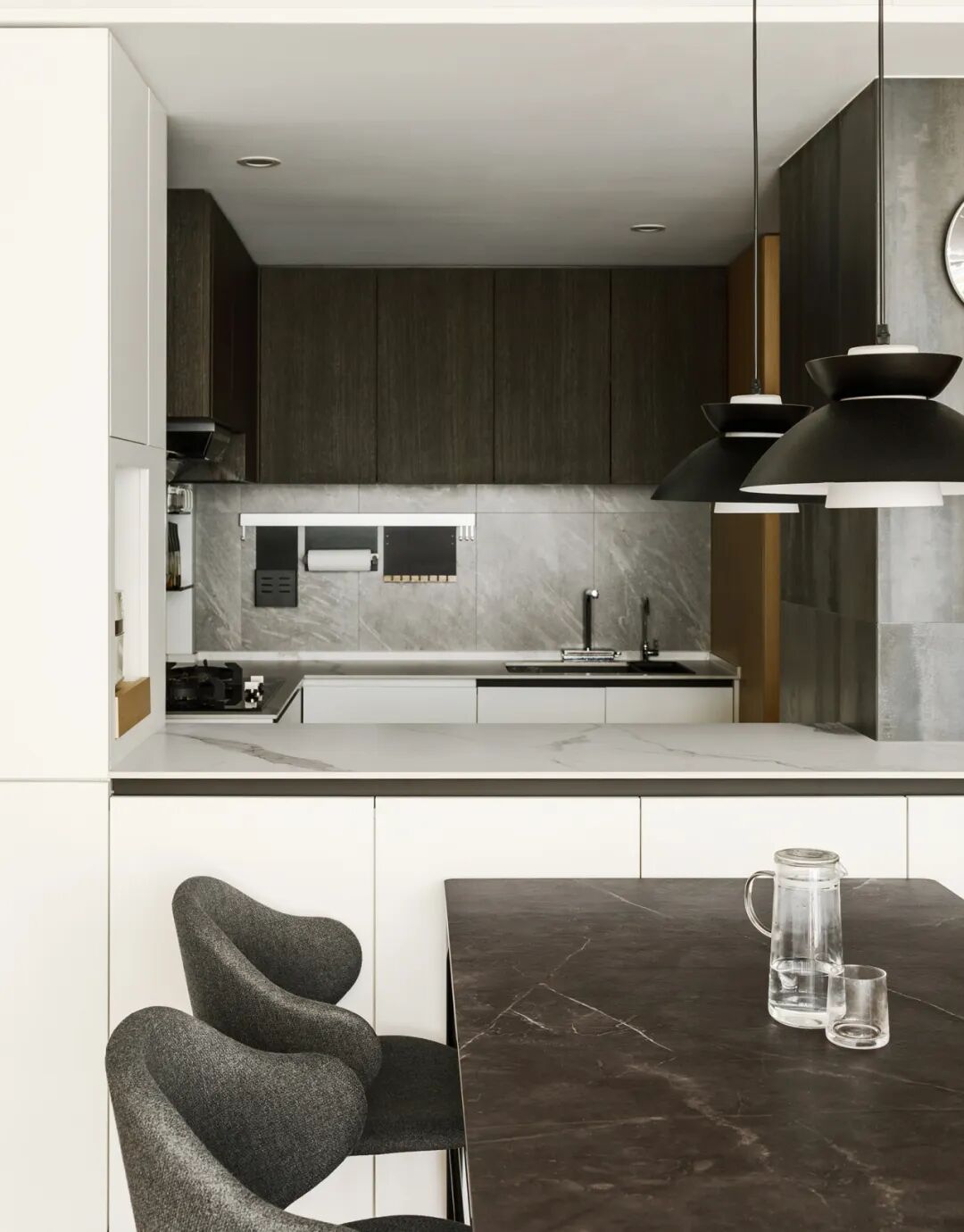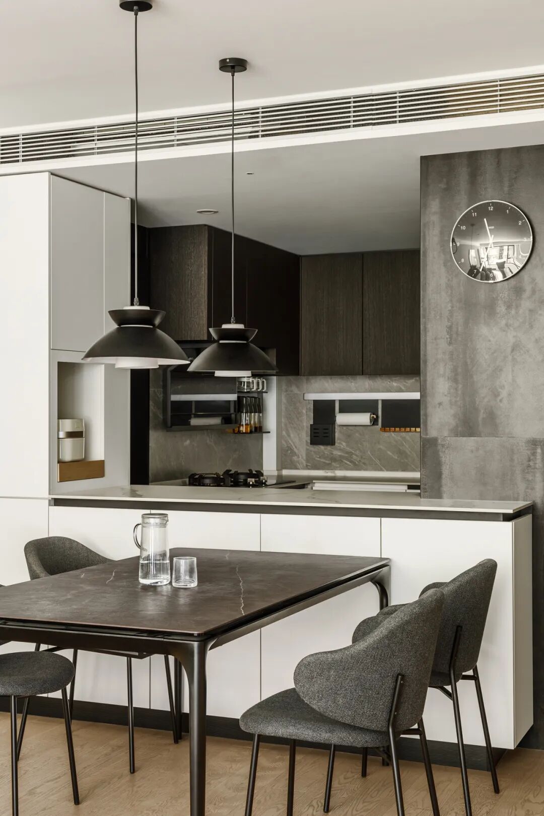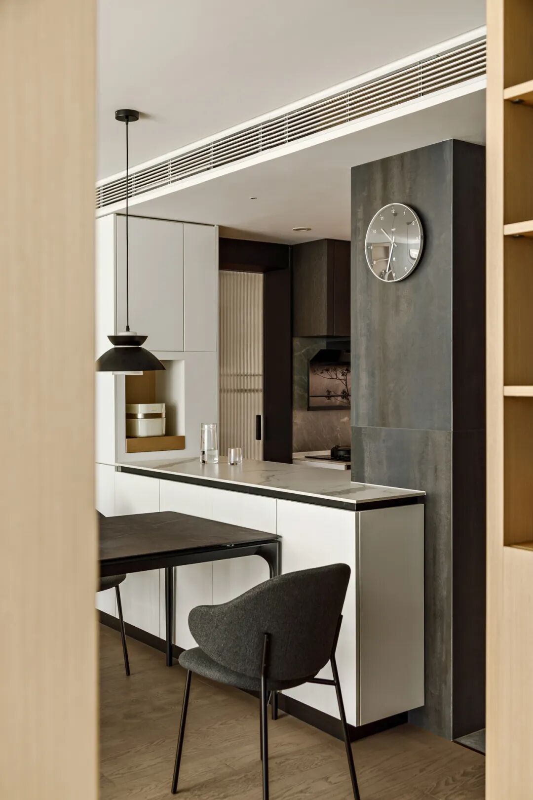 设计了岛台与餐厅相衔。操作台面更充裕,传菜也方便~匹配的餐桌是可伸缩的,抽出达2M,多人聚餐也不会觉得挤。不孤单的厨房:能听到客厅电视播报、播放的音乐,能参与家人谈话、一起摆桌...