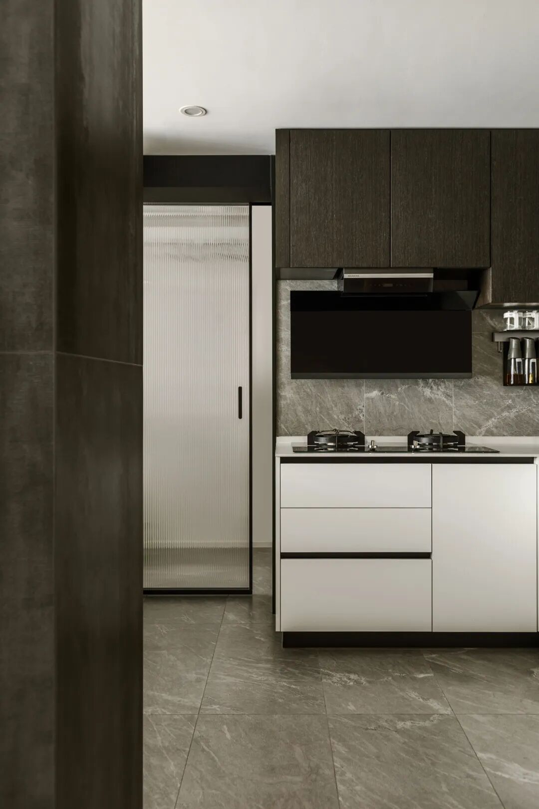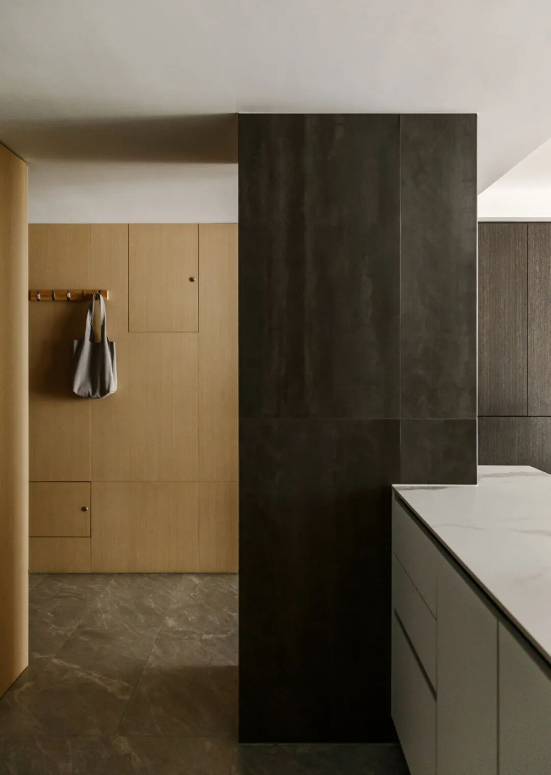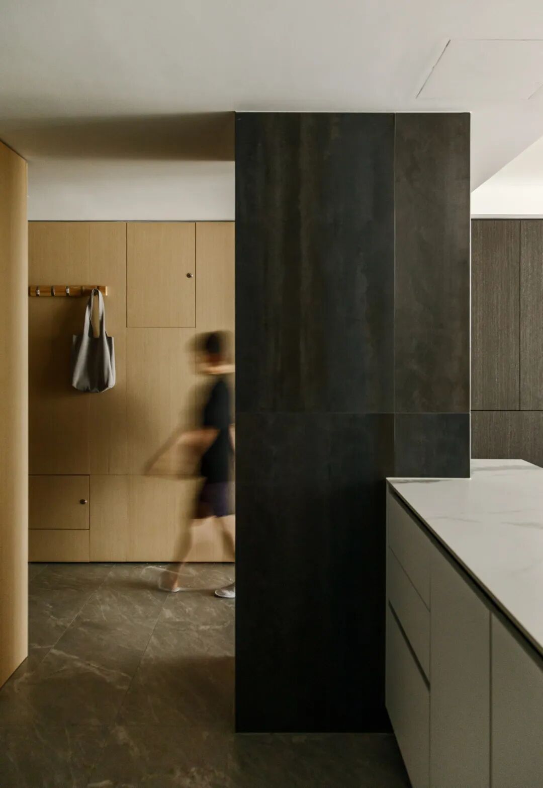 厨房入口处的“黑立柱”,内部是烟道。由于楼层高,它的体量比较大。用于修饰的表层瓷砖,那会儿刚刚走进中国市场。偏工业质感,手感却不冰冷,有些粗粝的天然光泽。避免了无趣笨重感。用了3年,状态依旧好~