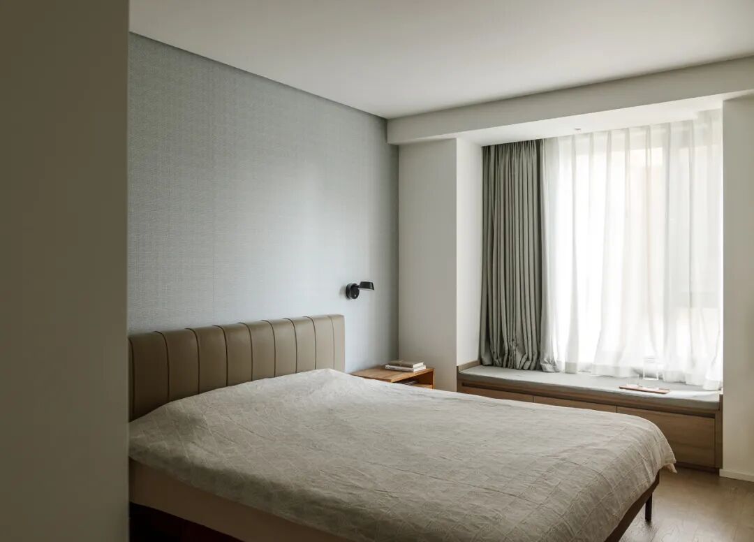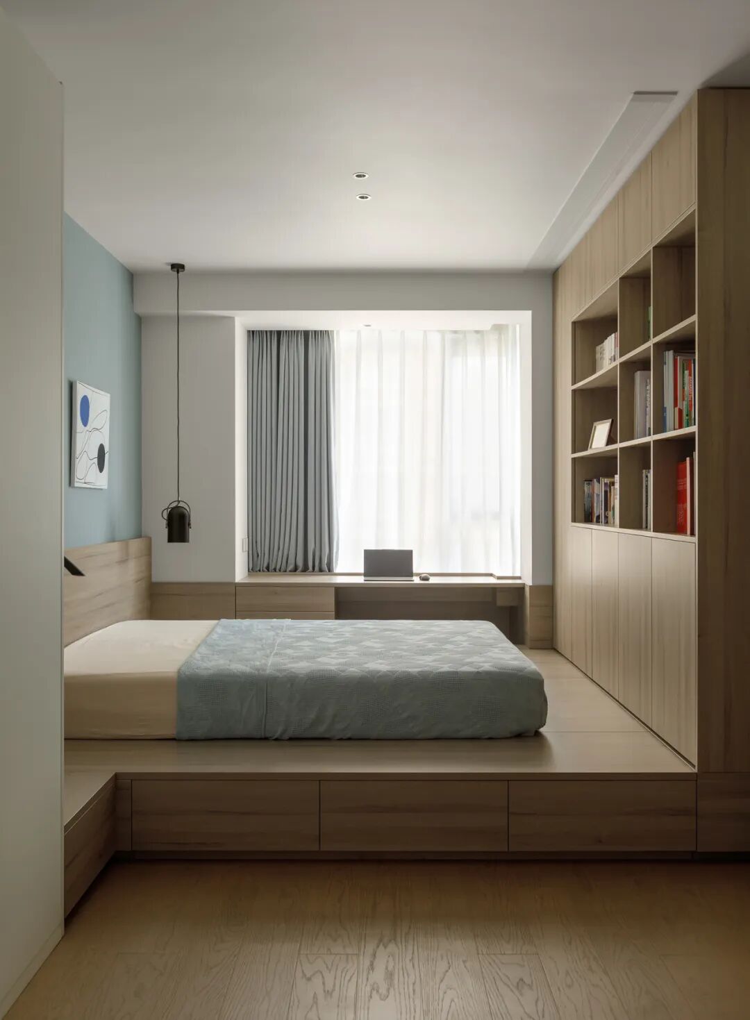孩子的卧室,是作为“多功能、中立空间”考虑的~特别之处:使用了能完全藏进墙内的双推推拉门;好划分区域、可储物的地台;还在窗边设计了书桌~