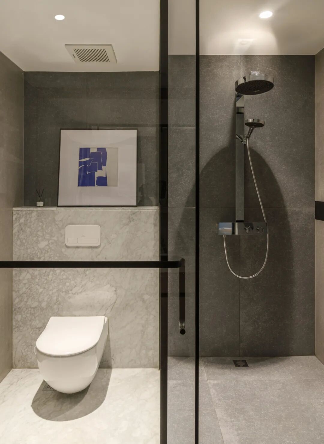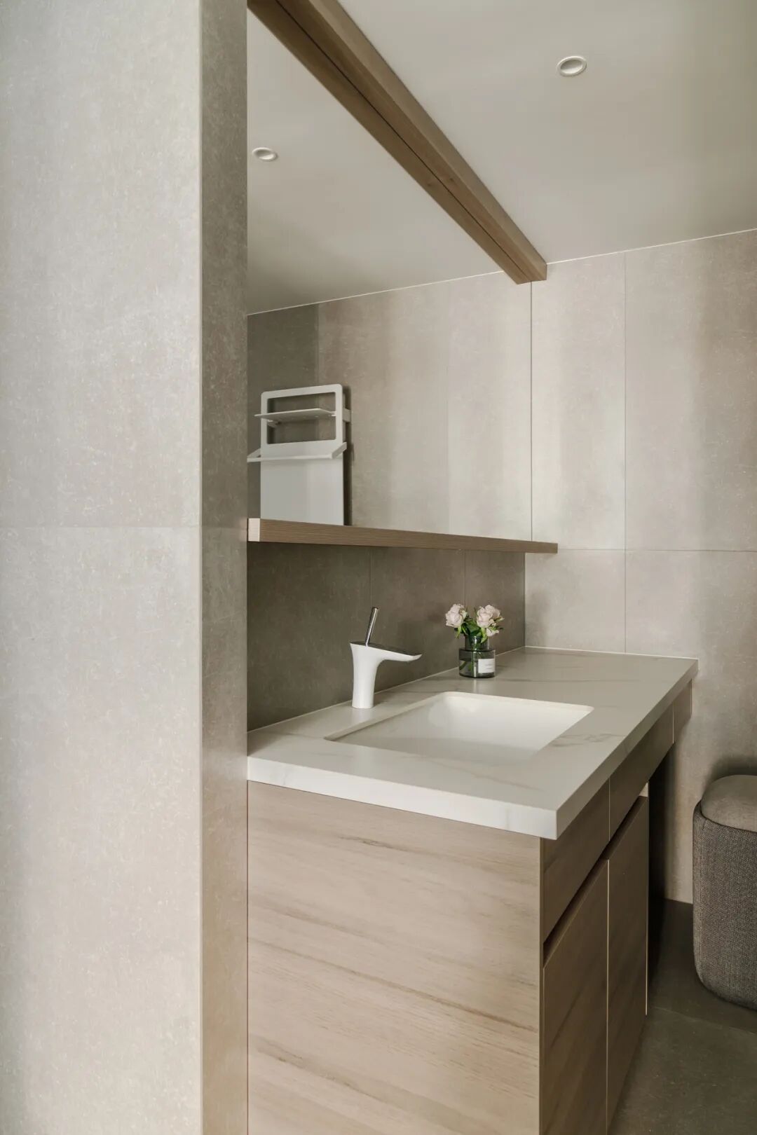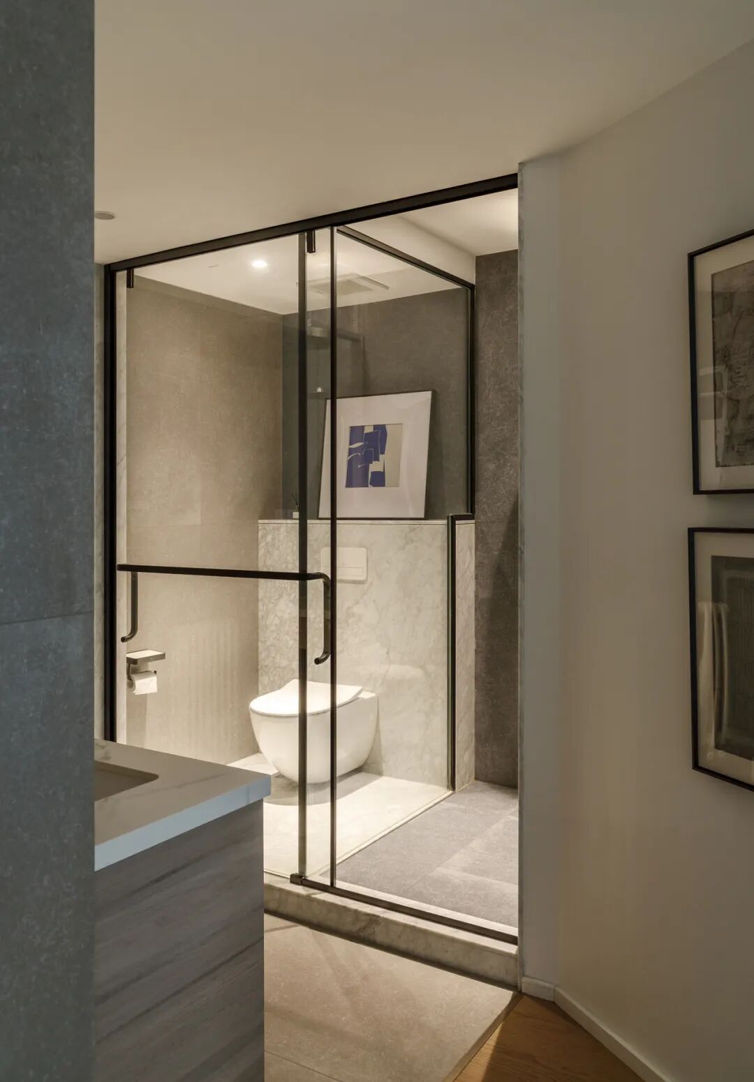 打开的卫生间,是三分离设计。外置的洗手台比较长:除去洗手池,一侧留有梳妆空间。马桶间与淋浴之间,用了一门两用的玻璃推拉门,简洁透气~
