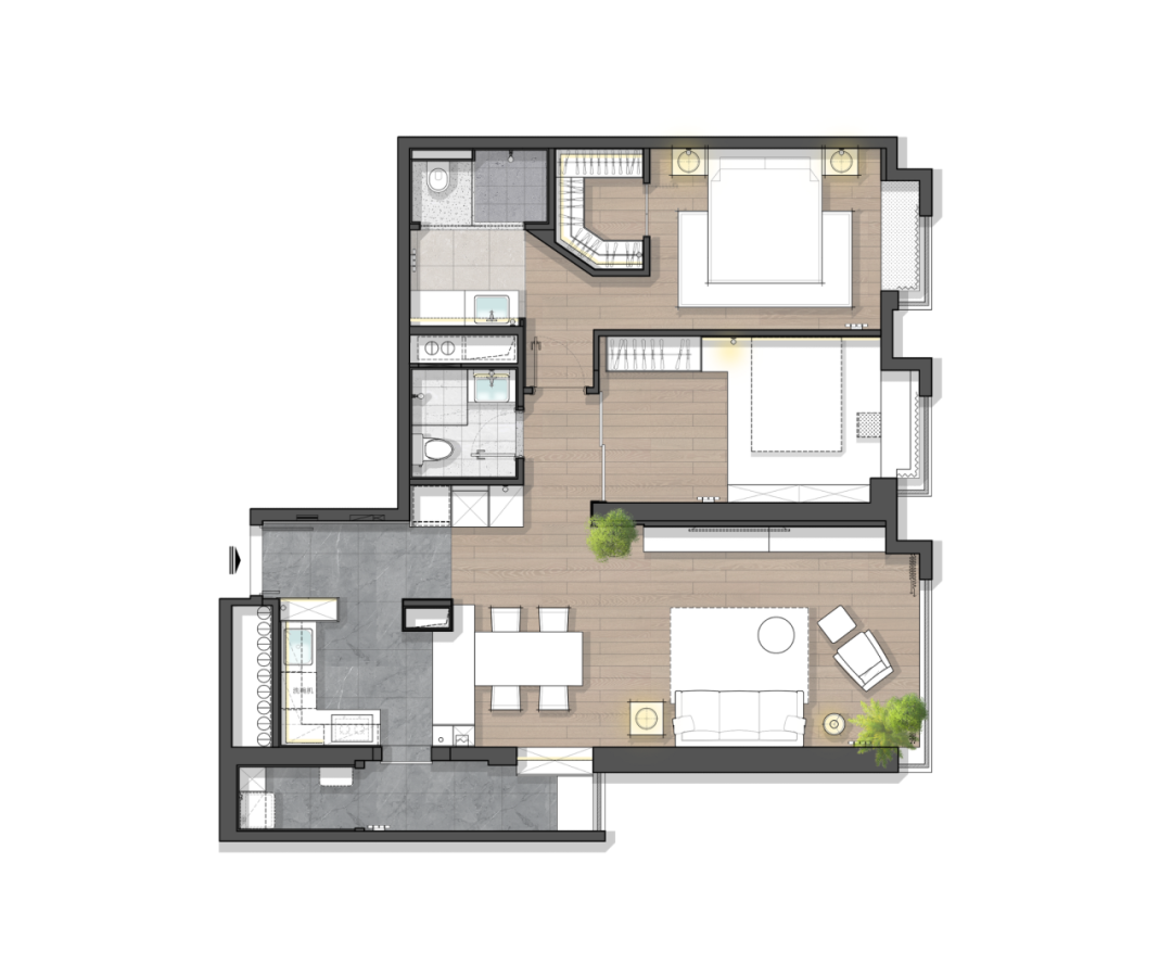 房子里缺少一个衣帽间。一直是女主人的遗憾。为了给她的衣物、首饰和包包一个容身之所,我们把主卧与主卫整合,改做比较开放的套间:左右两侧分别为卫生间和卧室;中间挤下了3㎡衣帽间,小巧但颇有仪式感~