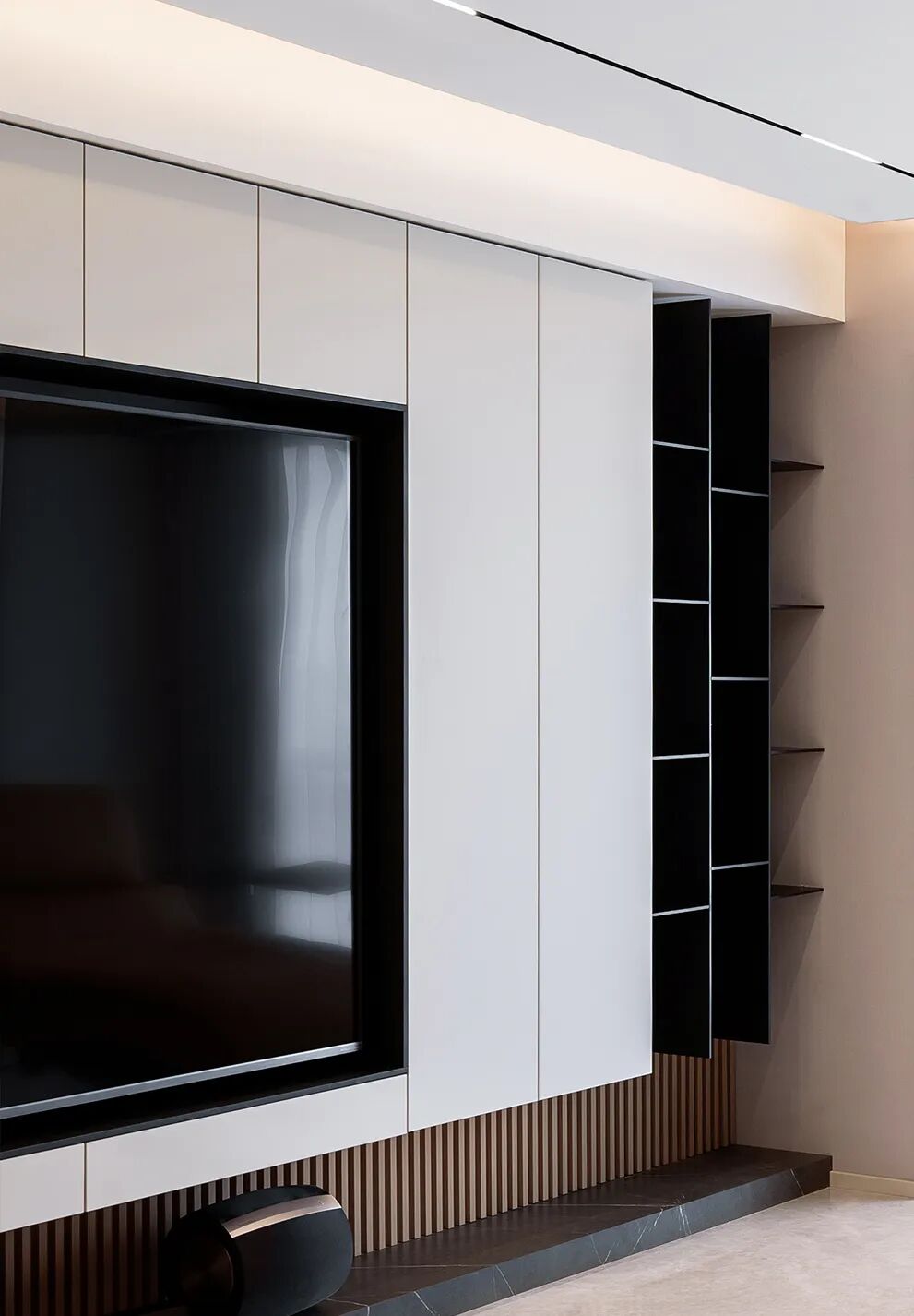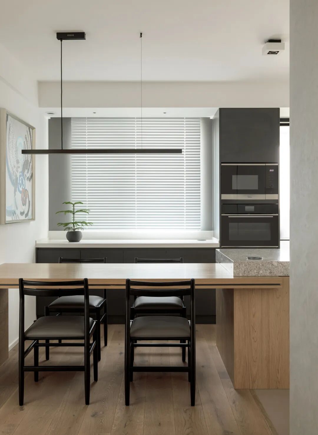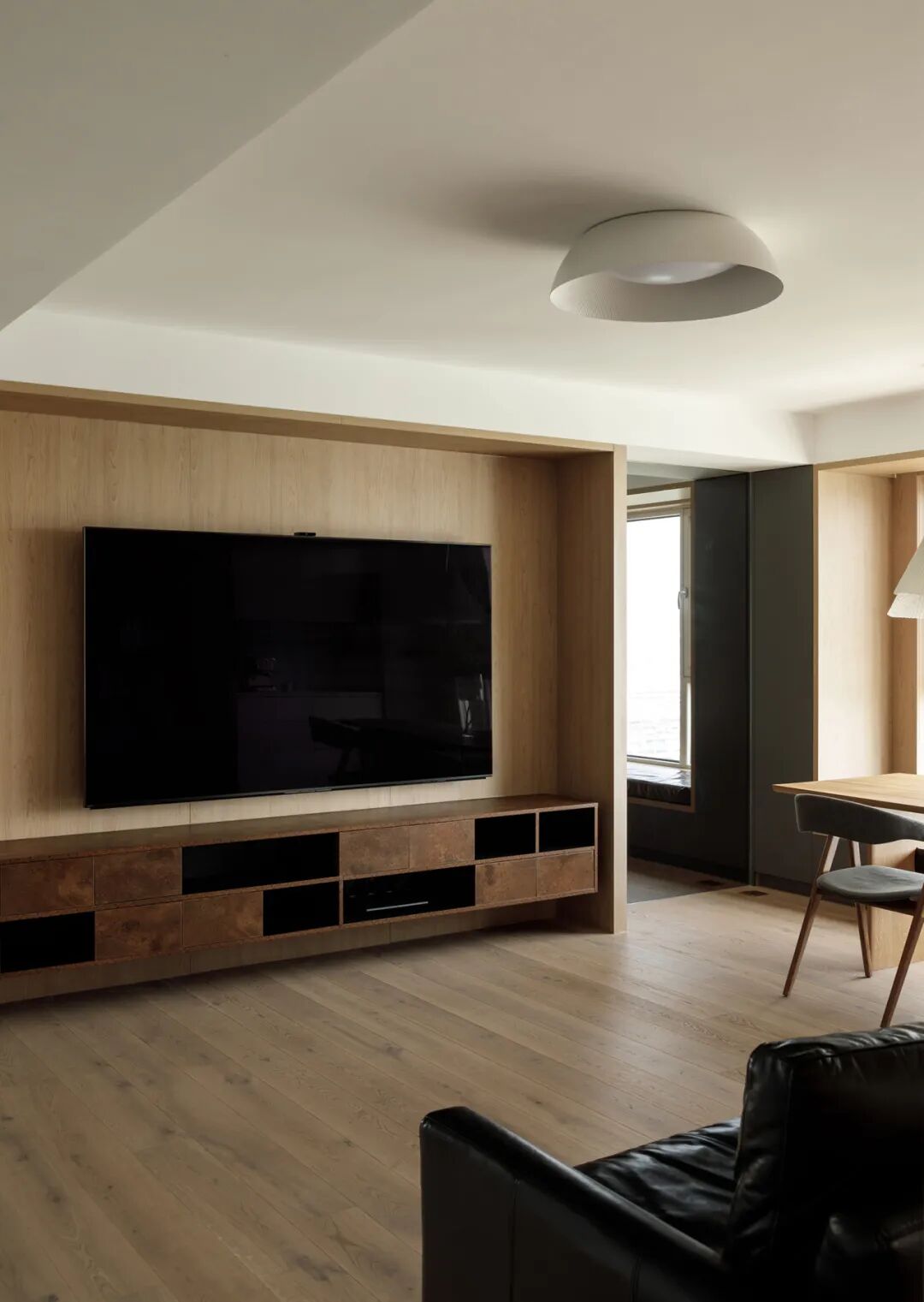 大起居厅可不止通透,它是客厅、餐厅、书房...互动满分。折线形长柜可不止有趣,它是餐边柜、储物间、大书架...为二娃之家预想了未来十几年生活需要;并打造柔软、有趣味、不呆板的环境~