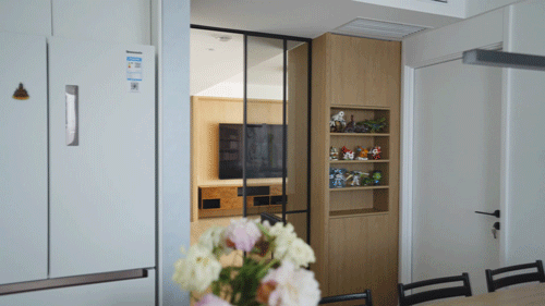 客厅相对的两面墙(电视背景墙与沙发背景墙),都有木质边框造型。绝不只为美观,它有一箭三雕之能!首先,解决两面墙长短差距大,感受失衡的问题,让客厅更规整;其二,一部分做了背靠背的柜子,朝客厅收纳书,朝餐厅展示乐高;其三,隐藏灰色玻璃推拉门轨道。