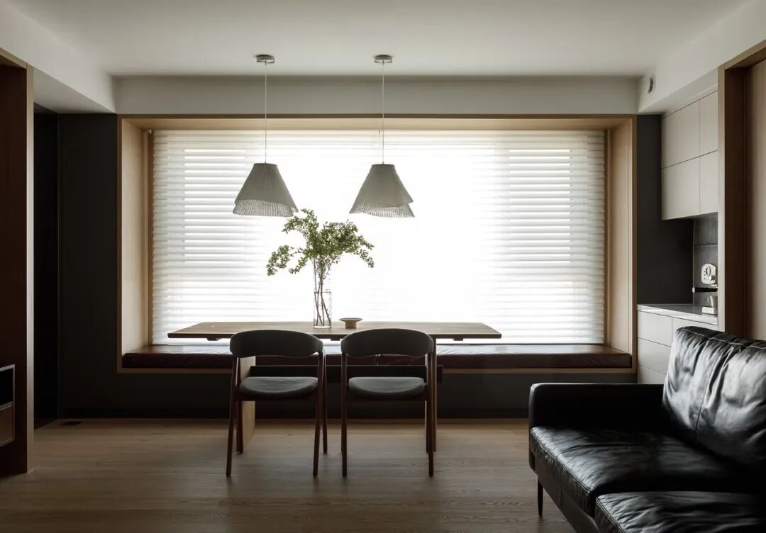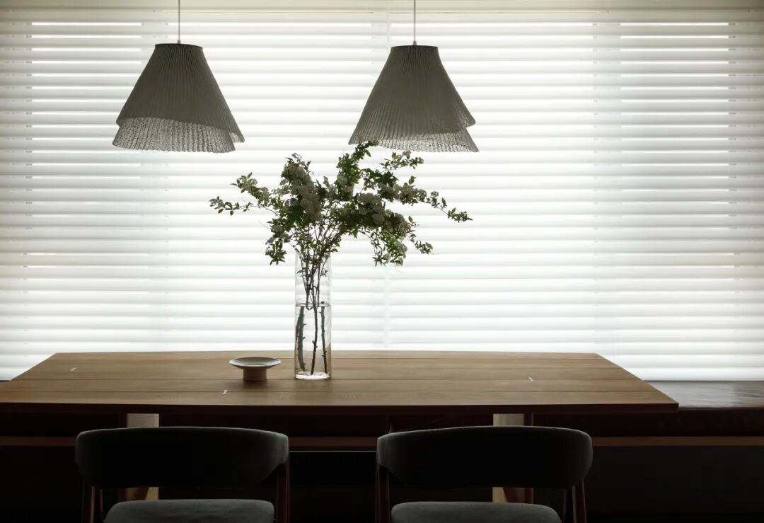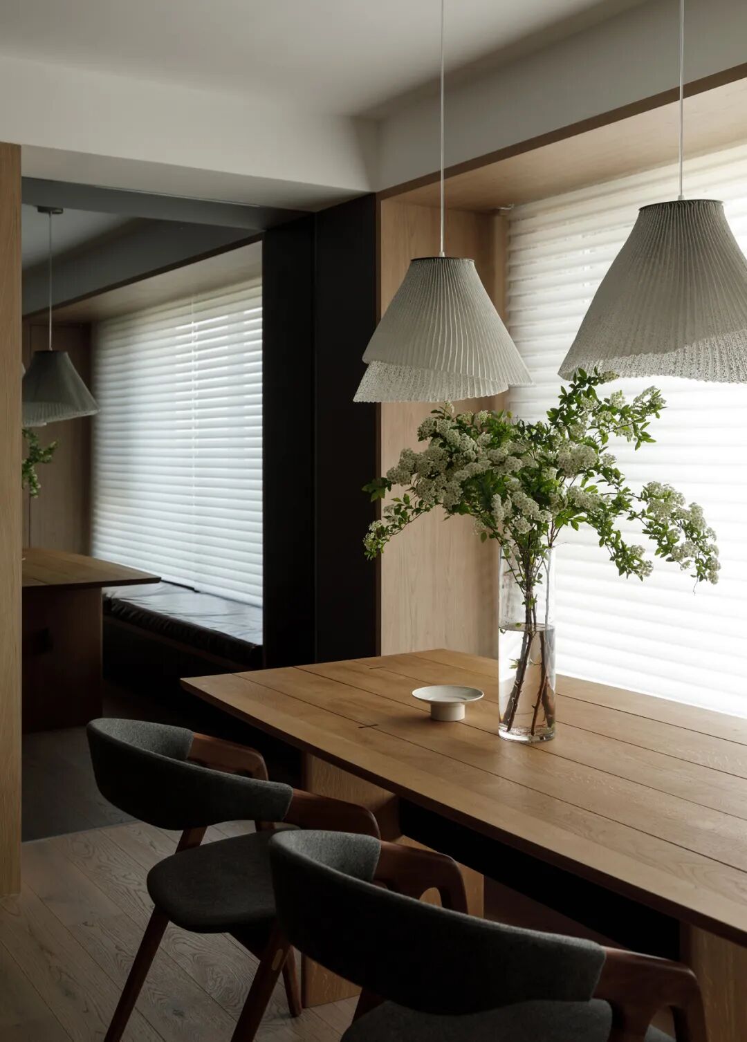 矩形大玻璃窗自是最靓风景:可见开阔天色、相望CBD高楼、脚下绿化森森、车川流不息...不辜负明媚阳光与好地段!我们用定制家具对整个窗户进行了包裹,倚窗形成坐榻,并设置2.2米长桌。