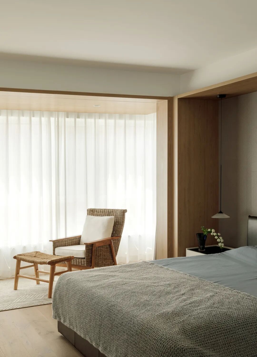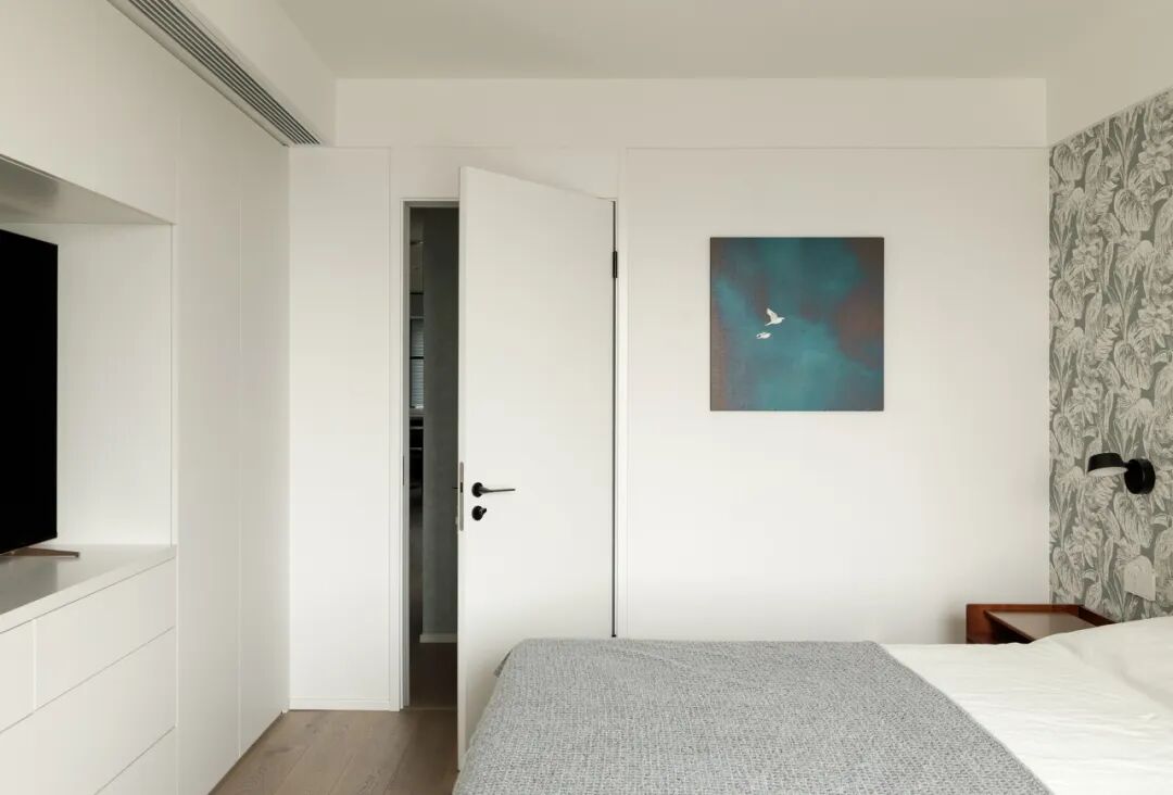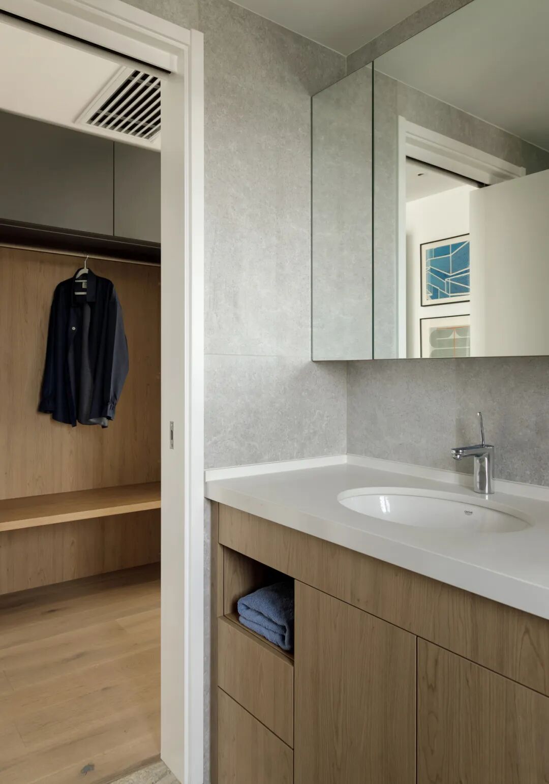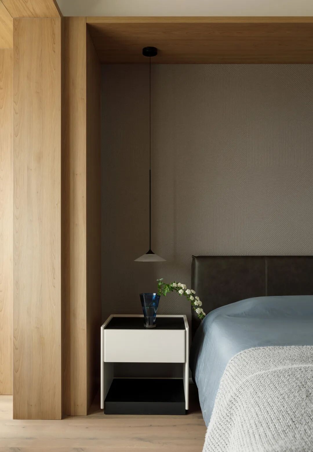 主卧室是由卫生间、睡眠区、书房组成的套房。收纳分散在床尾,自卫生间前挂衣区至阳台垭口设置了8门衣柜。把睡眠区和阳台,包裹在木色「框」内。实际上是想弱化阳台垭口的横梁,同时给予温暖~