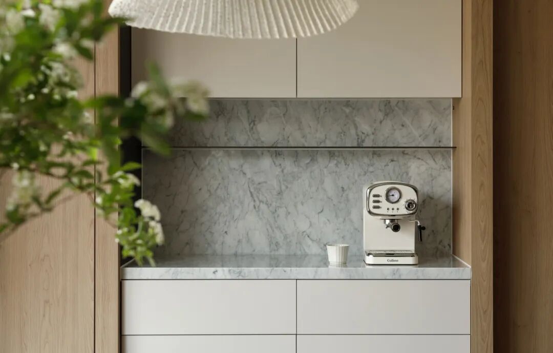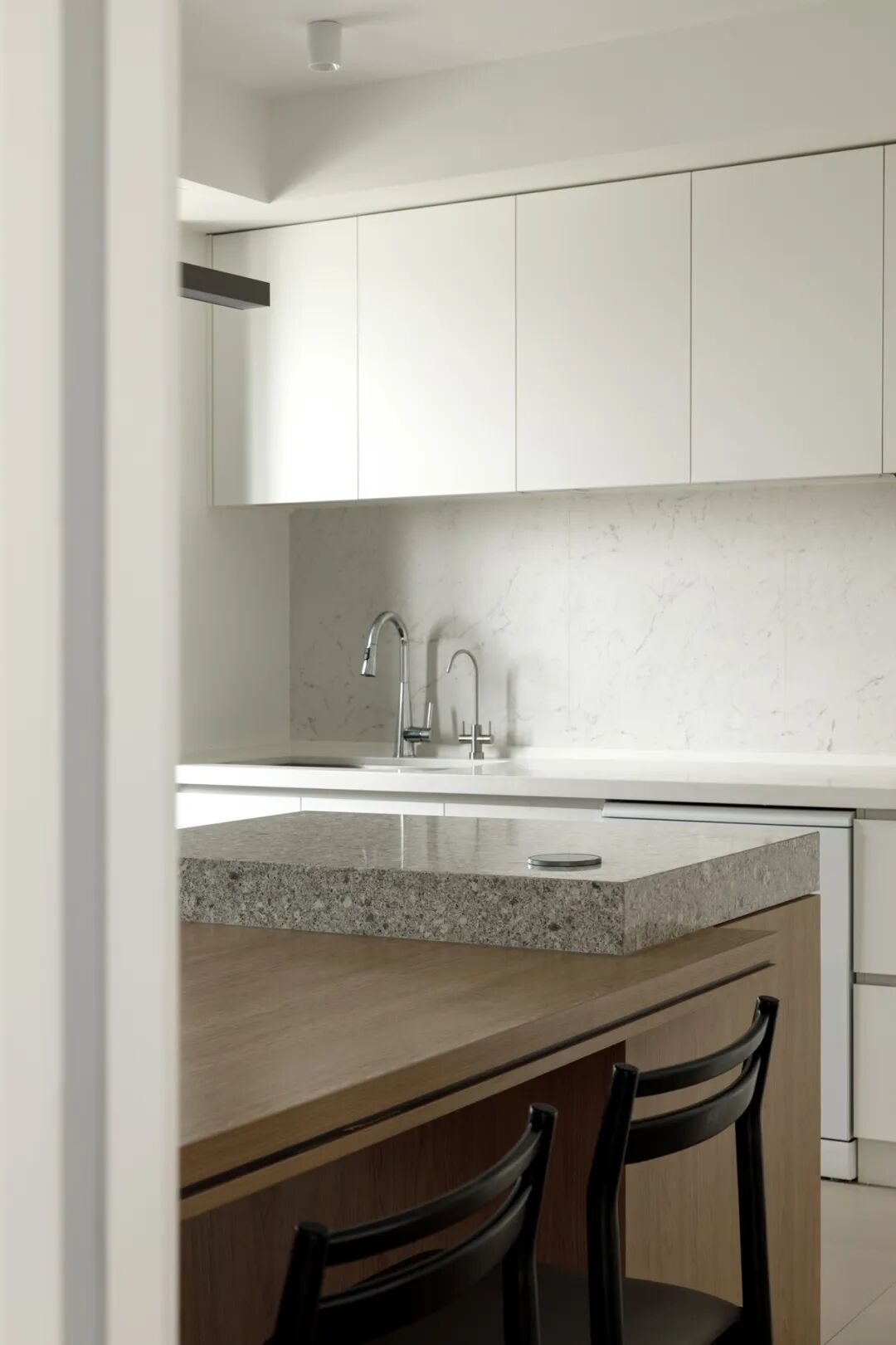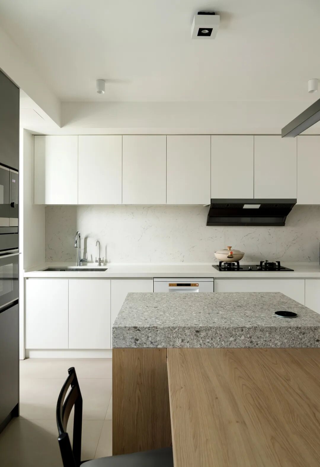从狭小昏暗,到通透、洁净、能让五位家庭成员'齐上阵'~厨房拆除了两侧墙体,餐厨一体布局。中厨的橱柜、冰箱、洗碗机选用全白色,提亮视觉。西厨由深色高柜叠放微波炉、蒸烤箱,回应多样烹饪需求。