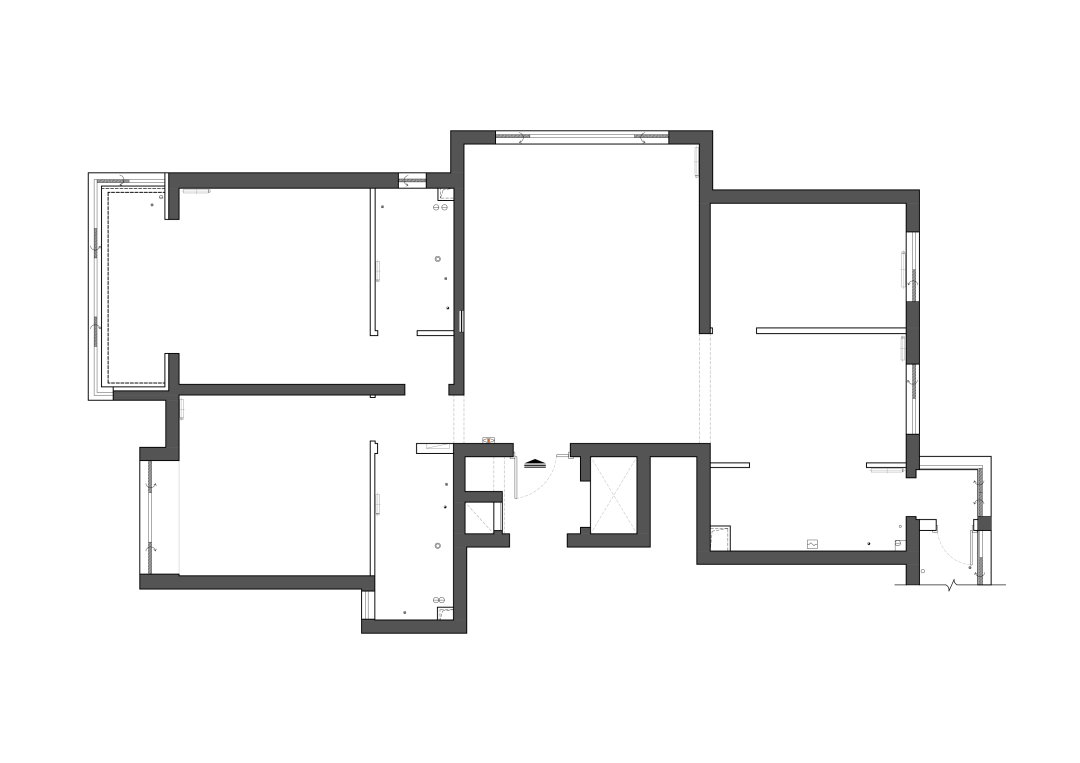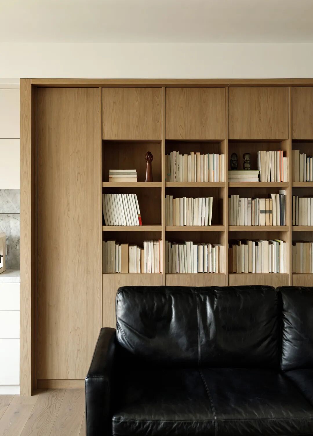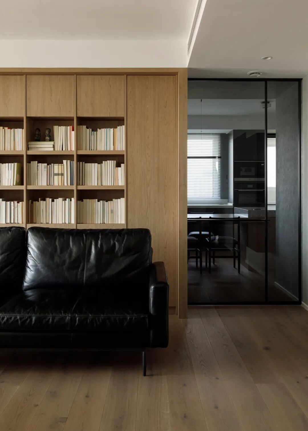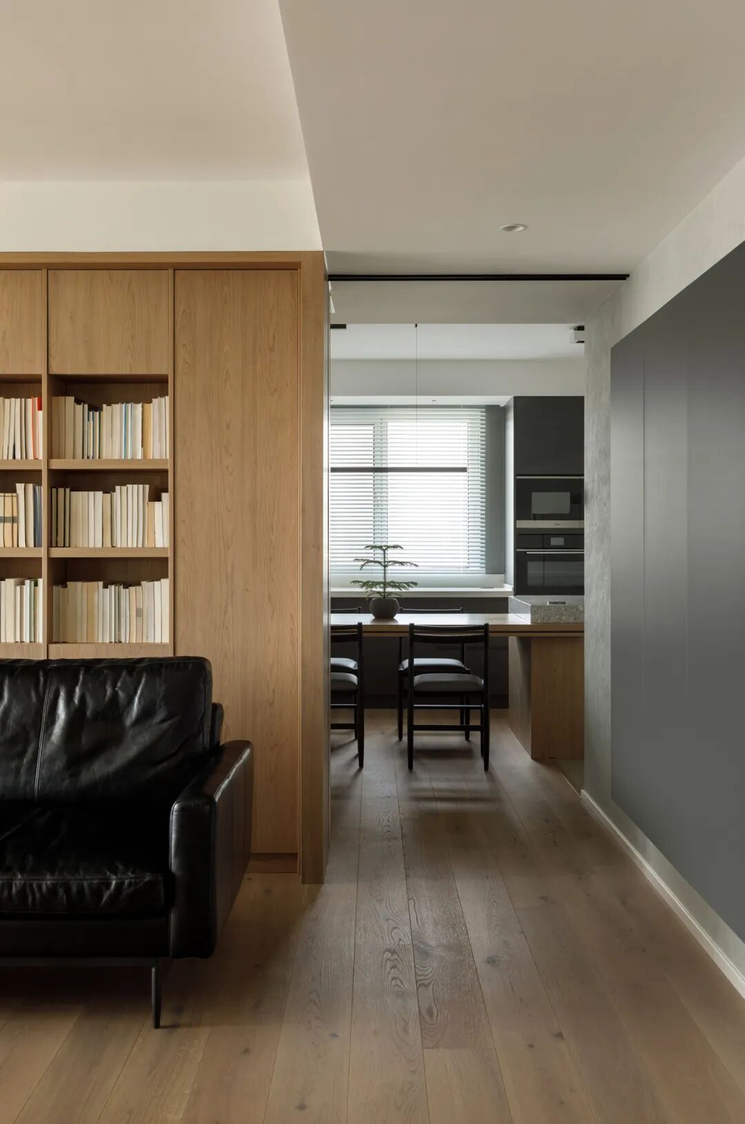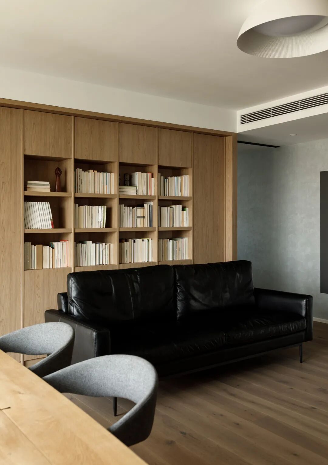 得益于户型结构,鞋柜、杂物柜能安置在电梯厅处。客厅专心发挥休闲互动主题。纸质书被设计为风景线之一,对爱书的家人来说是件极解压的事~我们有意强调呼吸感:将公共区域墙面涂刷了有天鹅绒肌理的灰色艺术涂料。挑选的家具,黑色皮沙发、置物推车…也都是简约中性的款式~