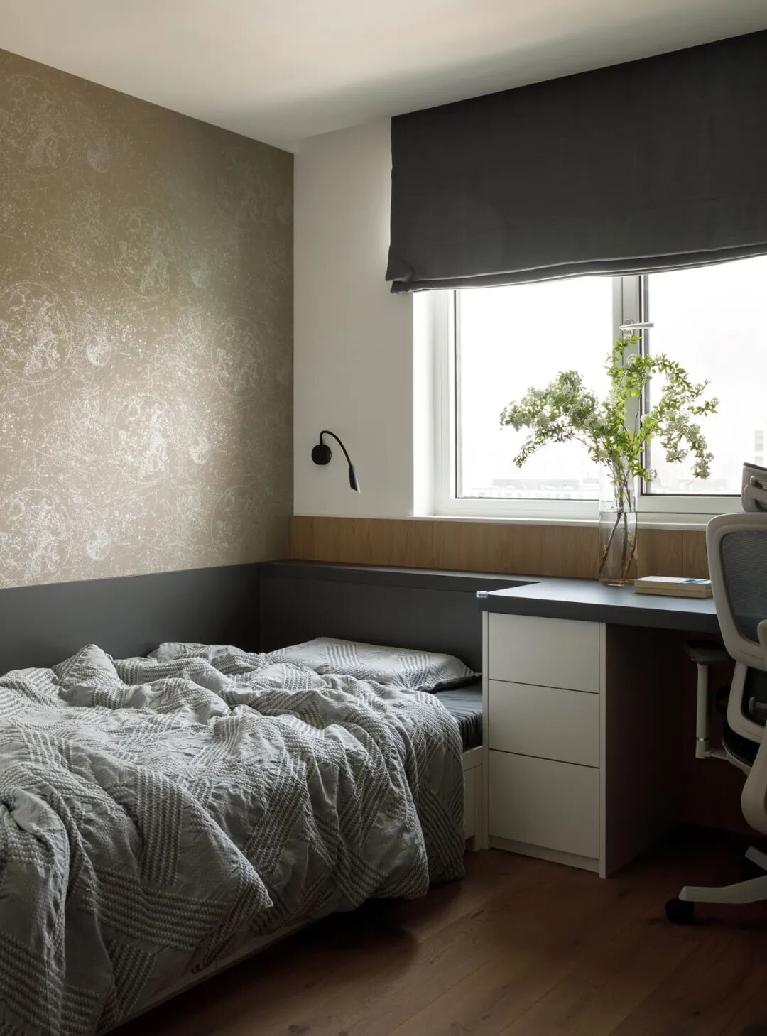 儿童房借用了部分餐厅空间扩大。设置白板墙、步入式衣帽间、功能床、书桌…金色星球壁纸,点点金光神秘又自由,显出男孩子的朝气。