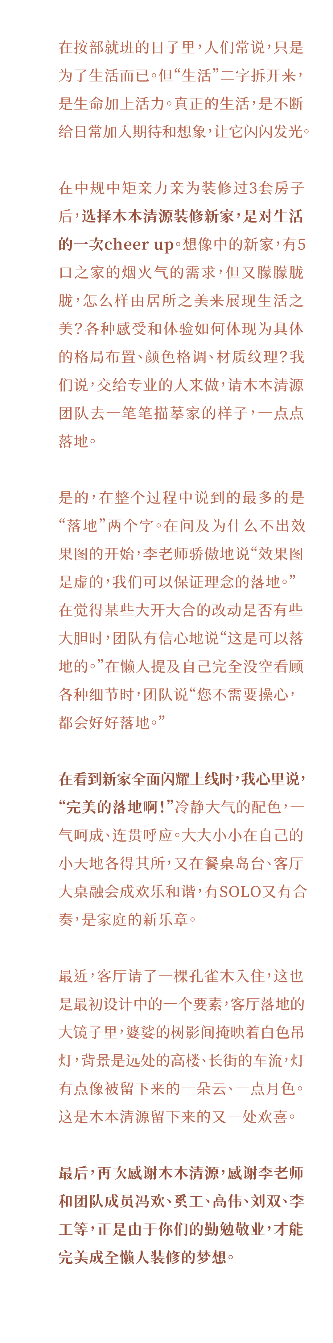 选了两盏轻盈飘逸的裙摆吊灯,搭配了光影朦胧的香格里拉帘...回应女主人细腻内心~最近,秦女士把她心心念念的绣线菊与一株孔雀木,请回了家~早在设计初期,我们便与她说定:“这儿会为你留一角绿植空间。”并在电视柜与飘窗之间设计了整面灰色镜子。此刻它映照着花草,成功模糊了空间界限,为家注入了双倍鲜活感~