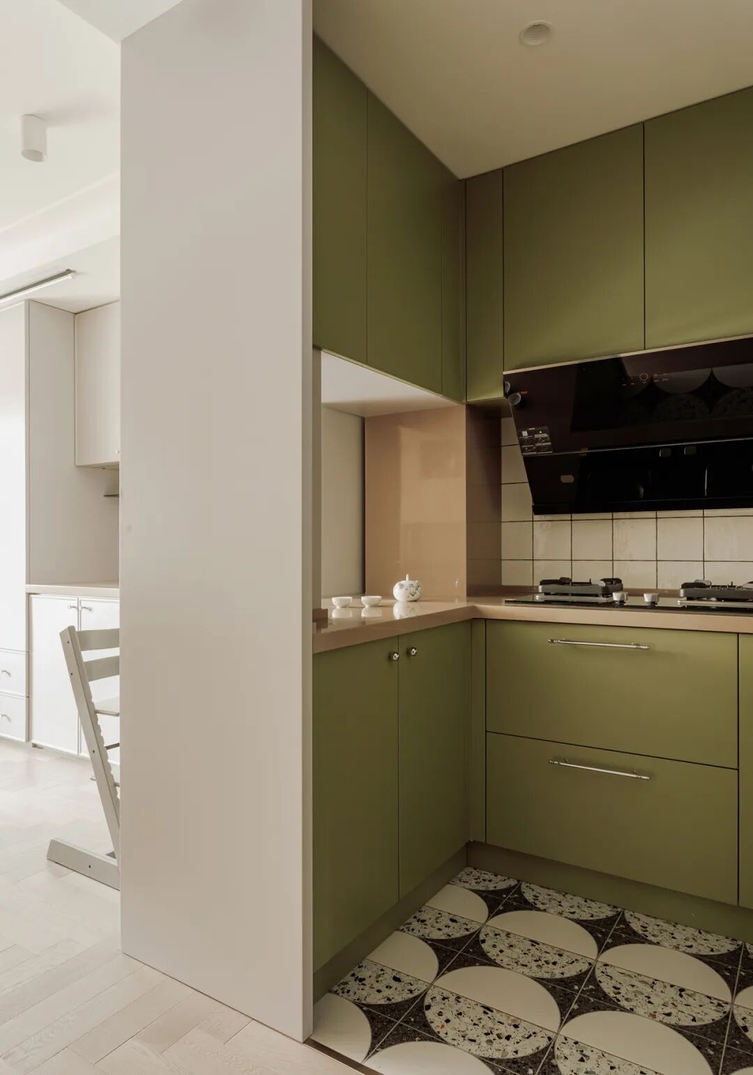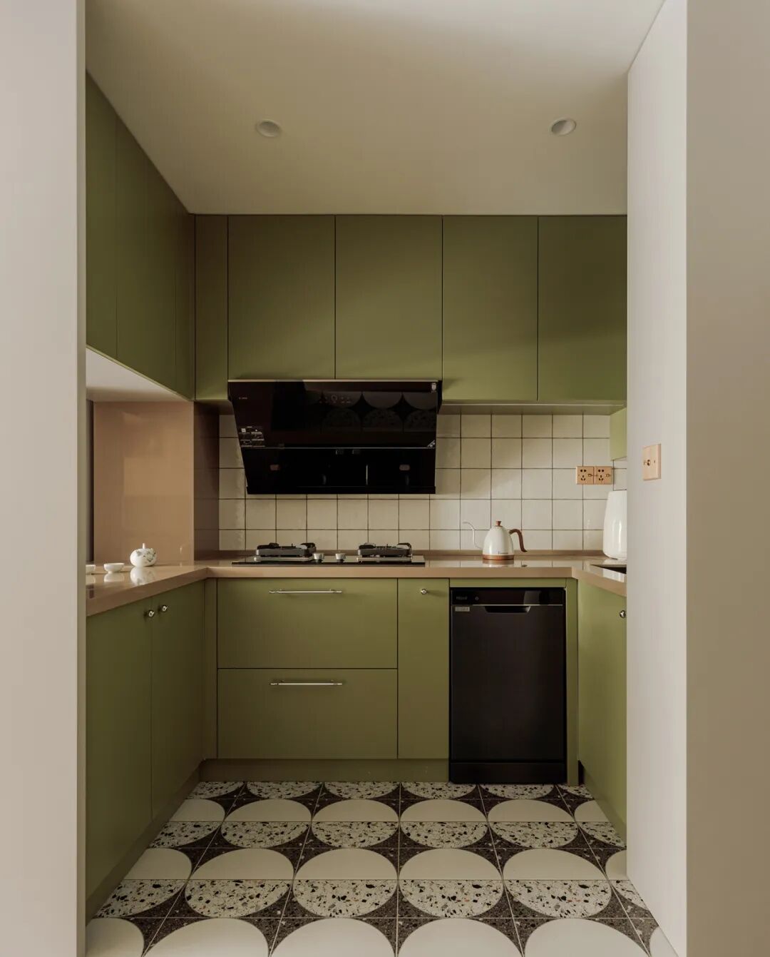 橱柜特别做了灰绿色,让紧凑的空间,更清新明亮。我们为罗女主选了一款嵌入式小洗碗机,辅助家务,地面的马赛克砖,既美观又易于清洁。