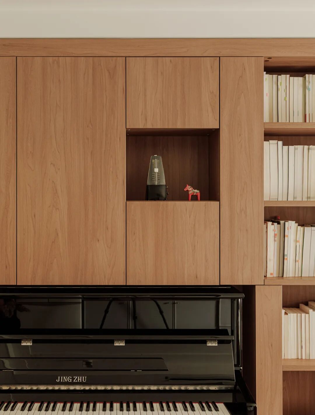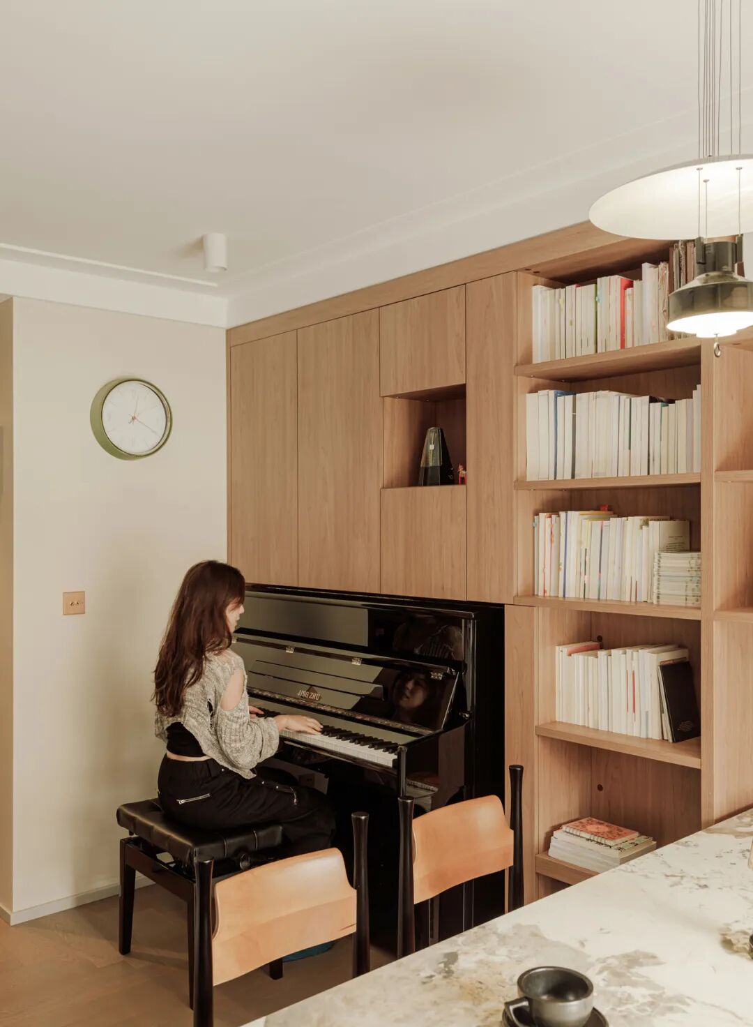 主卧与阳台合并规划,形成一个多功能的起居室。在前方区域设置客餐厅、书柜、钢琴等,罗女士和儿子可以在这里吃饭,休息,看书,弹钢琴…..