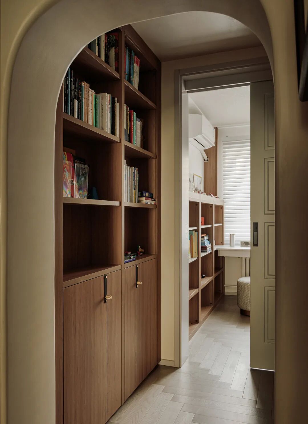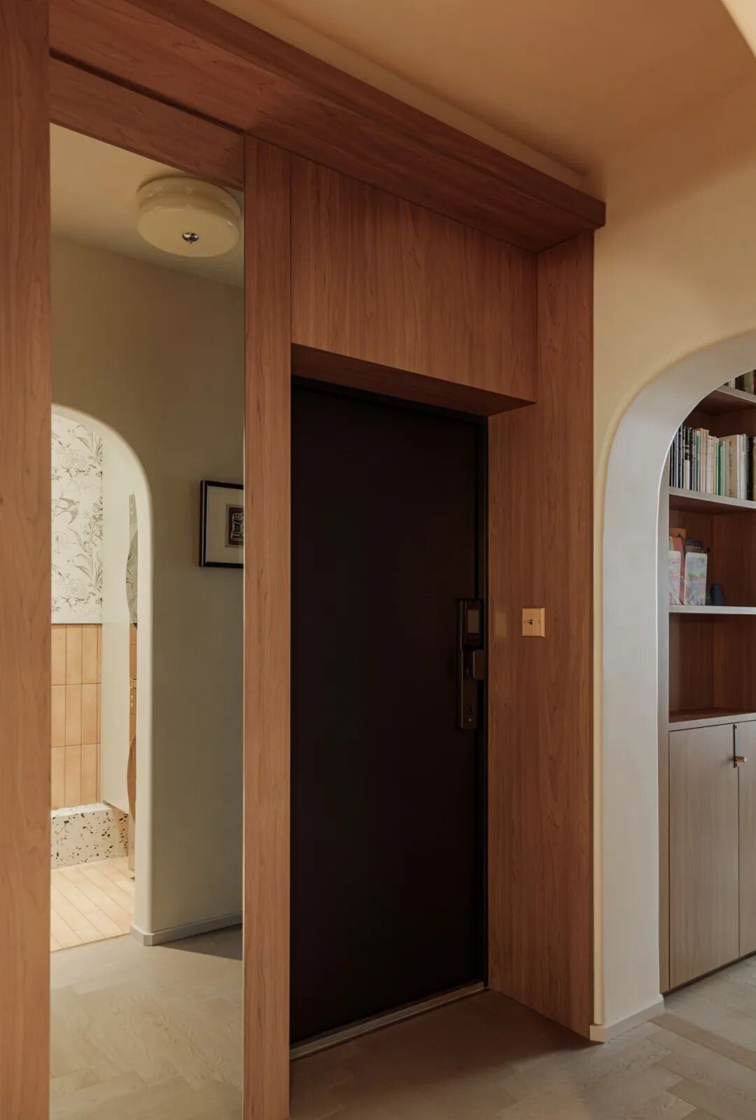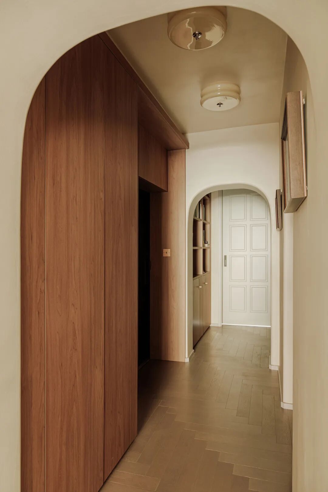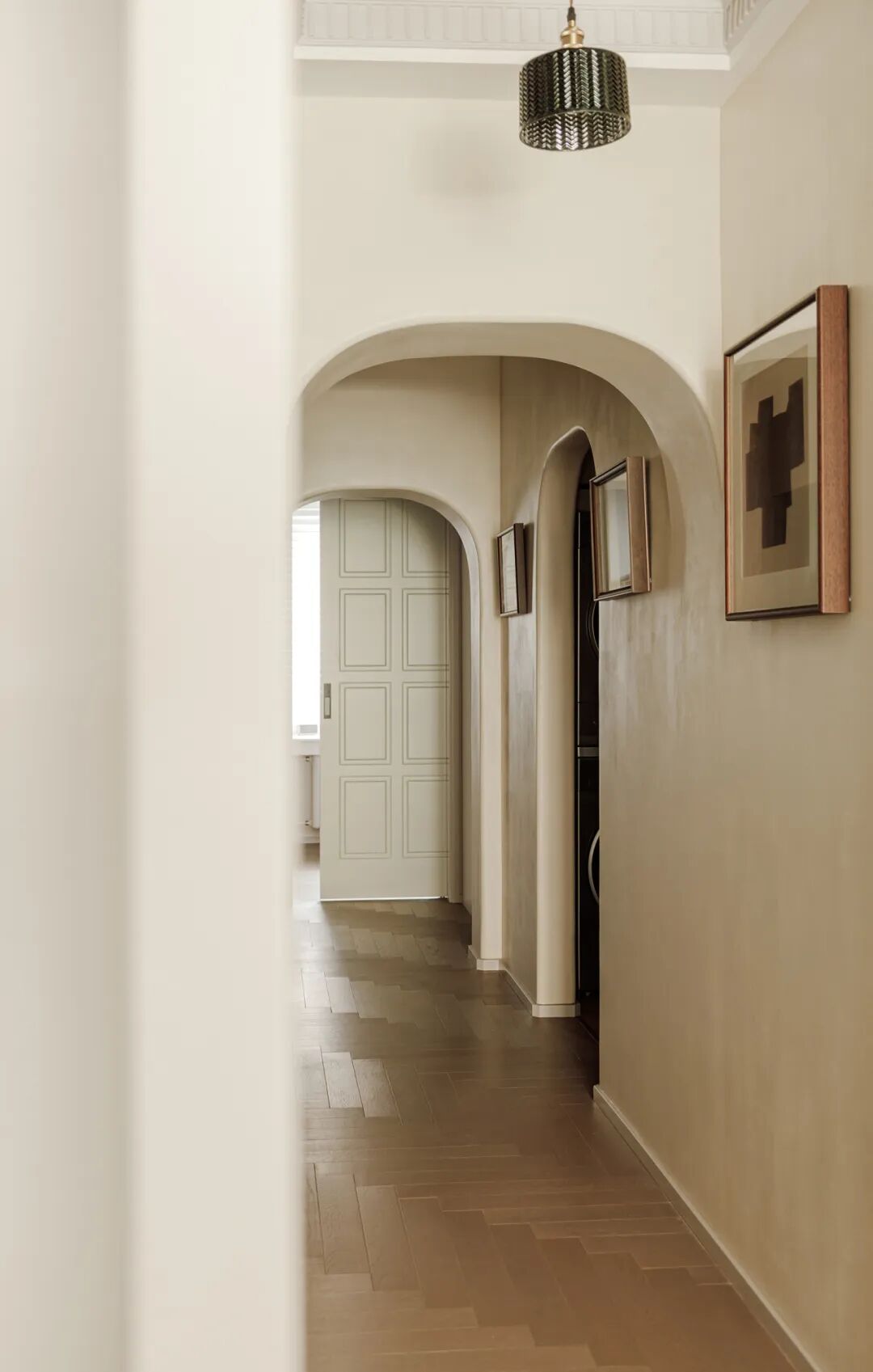 罗女士和儿子进入家门,首先映入眼帘的便是那条别具一格的长廊。设计师巧妙地运用了拱形垭口设计,使得原本狭长的空间显得宽敞而富有层次感。复古感十足的鱼骨拼地板与木色画框相映成趣,仿佛将人带入了一个充满历史韵味的艺术画廊。