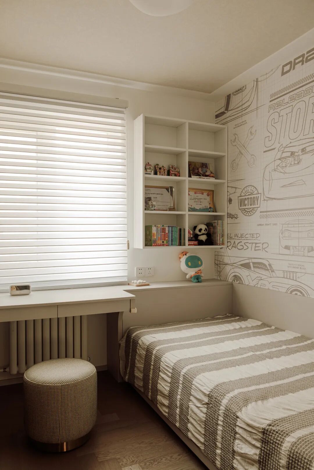 在儿童房外设置一个家庭集中储物区,这个区域可以有效地整理和管理家庭的日常用品。储物区的左侧补充书架和储物柜,用于存放罗女士儿子的书籍和玩具等儿童用品。