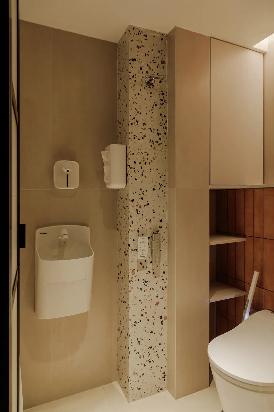 卫生间内部布局简洁,只设置马桶区和淋浴区,保证每个区域的尺度足够舒适,避免拥挤。在卫生间内补充一个小巧的壁挂式洗手盆,这样可以在不占用过多空间的同时,让罗女士和儿子洗手更方便!