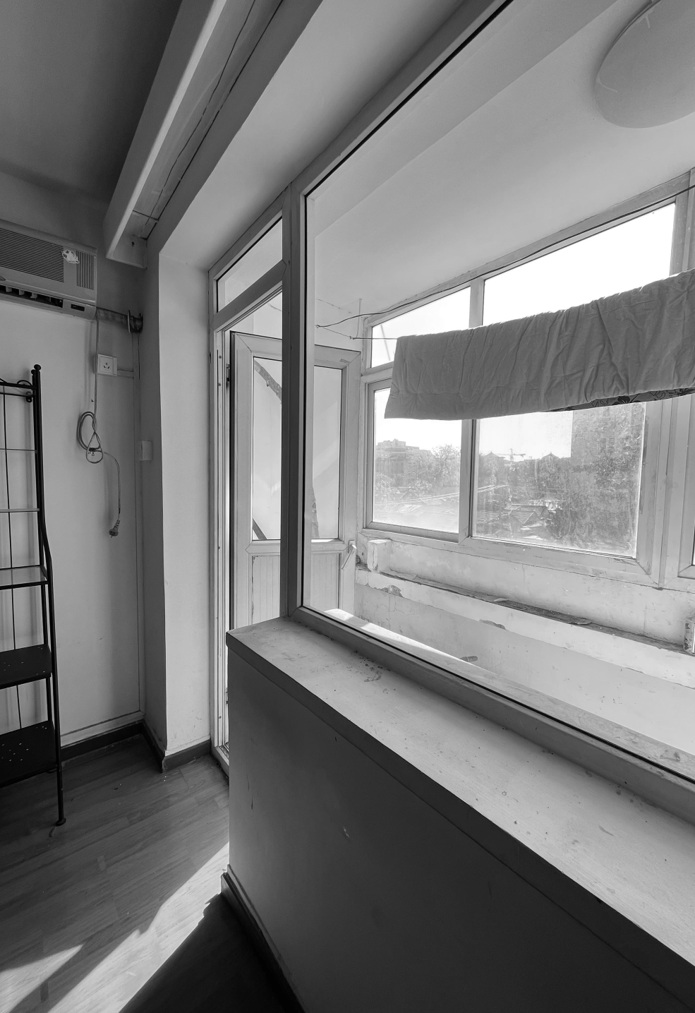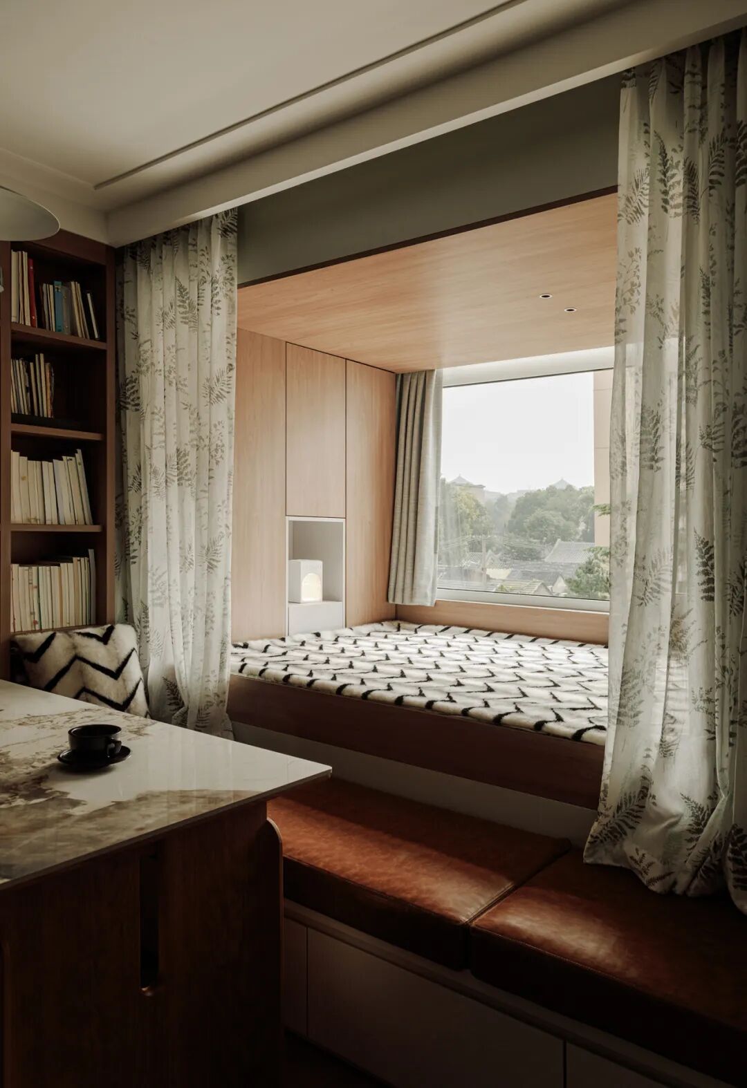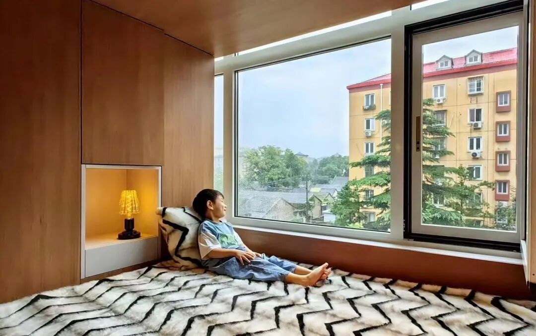 后方的阳台区域改造成床榻和衣帽间,提供休息和更衣的私密空间,同时也增加了储物功能,罗女士和儿子可以存放很多物品