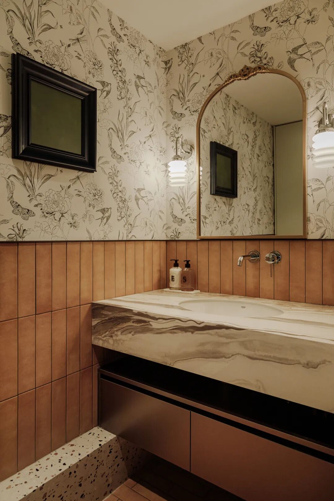 暖木色的长条瓷砖与复古花鸟壁纸的搭配,使得这个小空间充满了艺术气息。每一个细节都经过了精心的挑选和搭配,以确保整体风格的和谐统一。