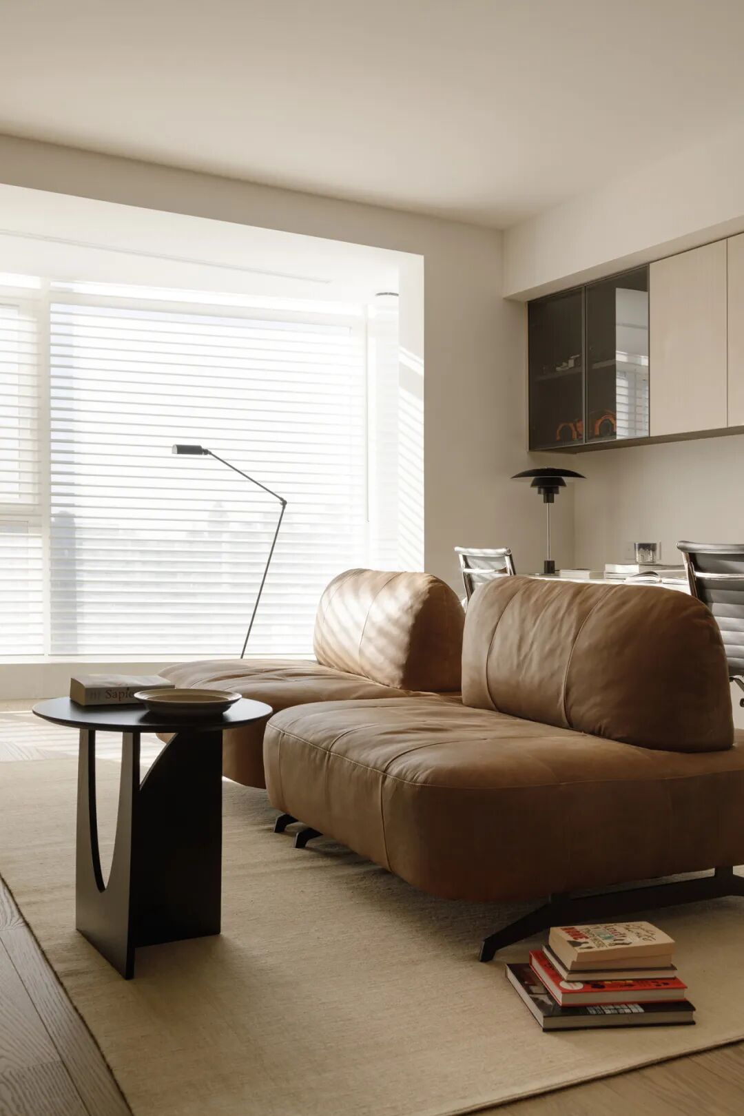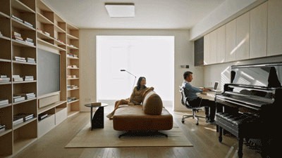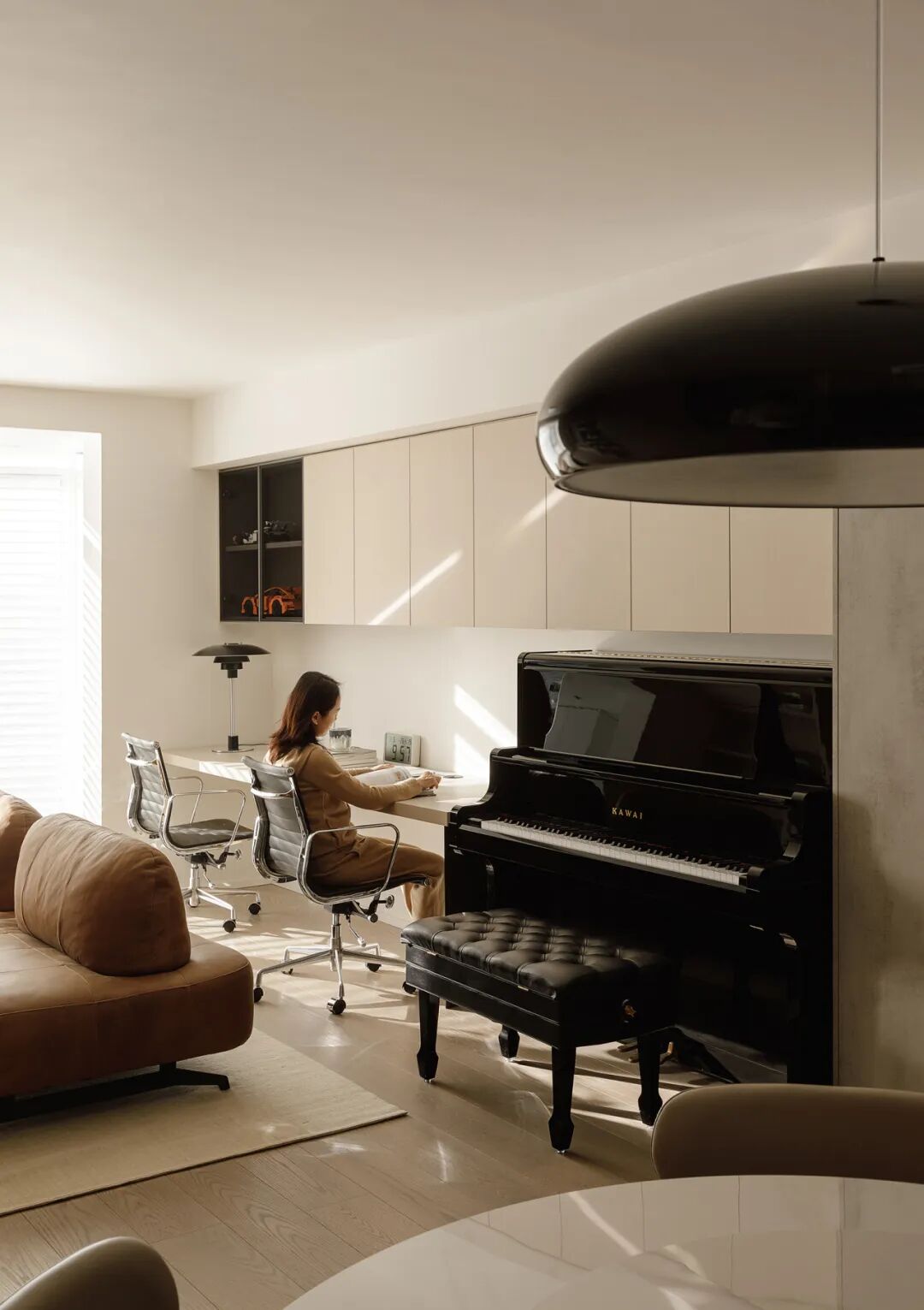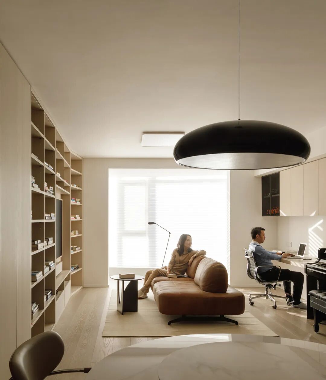 阳春三月,我们敲开了Ms.L的家门。她和先生太亲切贴心了,笑盈盈的说:“你们尽情拍,一定要拍好~”并为我们放起轻快的音乐。说到她家这款棕色模块沙发,坐背可以挪动。夫妻俩一起出镜,演示了常用变化:坐同侧、背靠背、变成床小憩、和办公区互动...方案‘预言’的:彼此依偎在沙发上;孩子们可以绕着追跑;哪怕各有任务,因陪伴而满腔柔情~实现在眼前。大家当场感慨:“把客厅、餐厅、书房揉一块儿做起居室的决定太对了!”