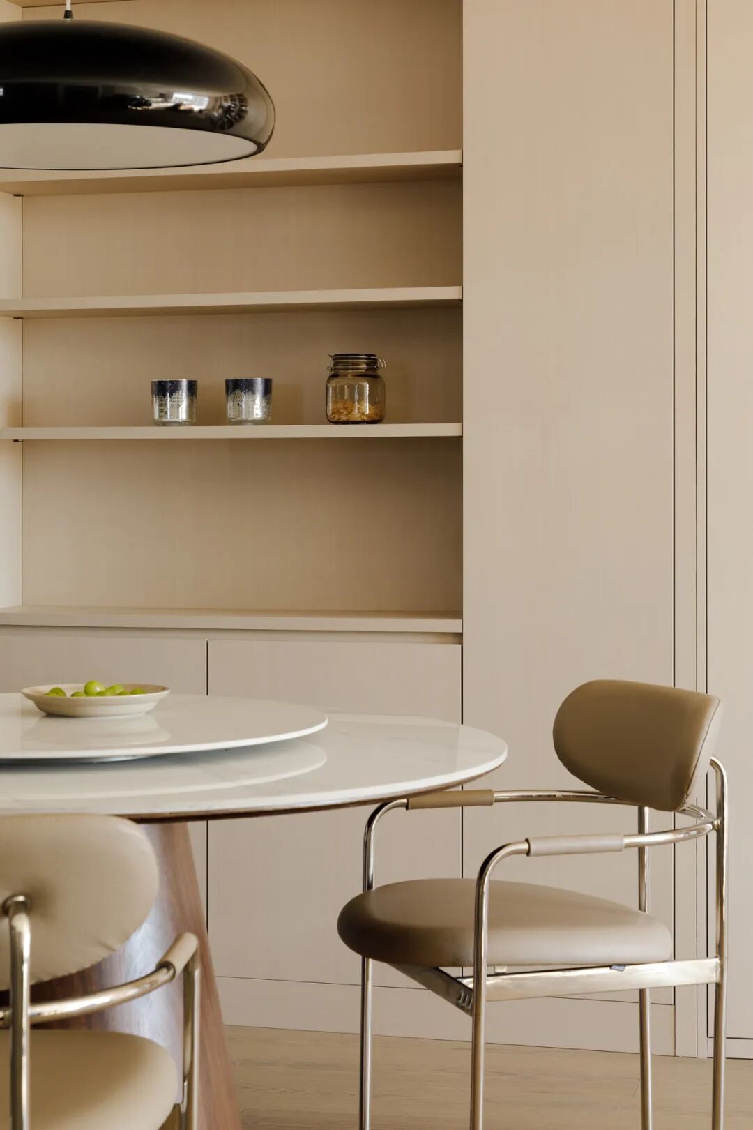餐厅用了盏黑色大花苞吊灯。下方搭配了更适合国人习惯的圆餐桌。胡桃木底座,暖色吸睛。餐边柜的布置还处于未完待续状态,等Ms.L放上喜爱的香薰、鲜花、茶具,会更有温度。