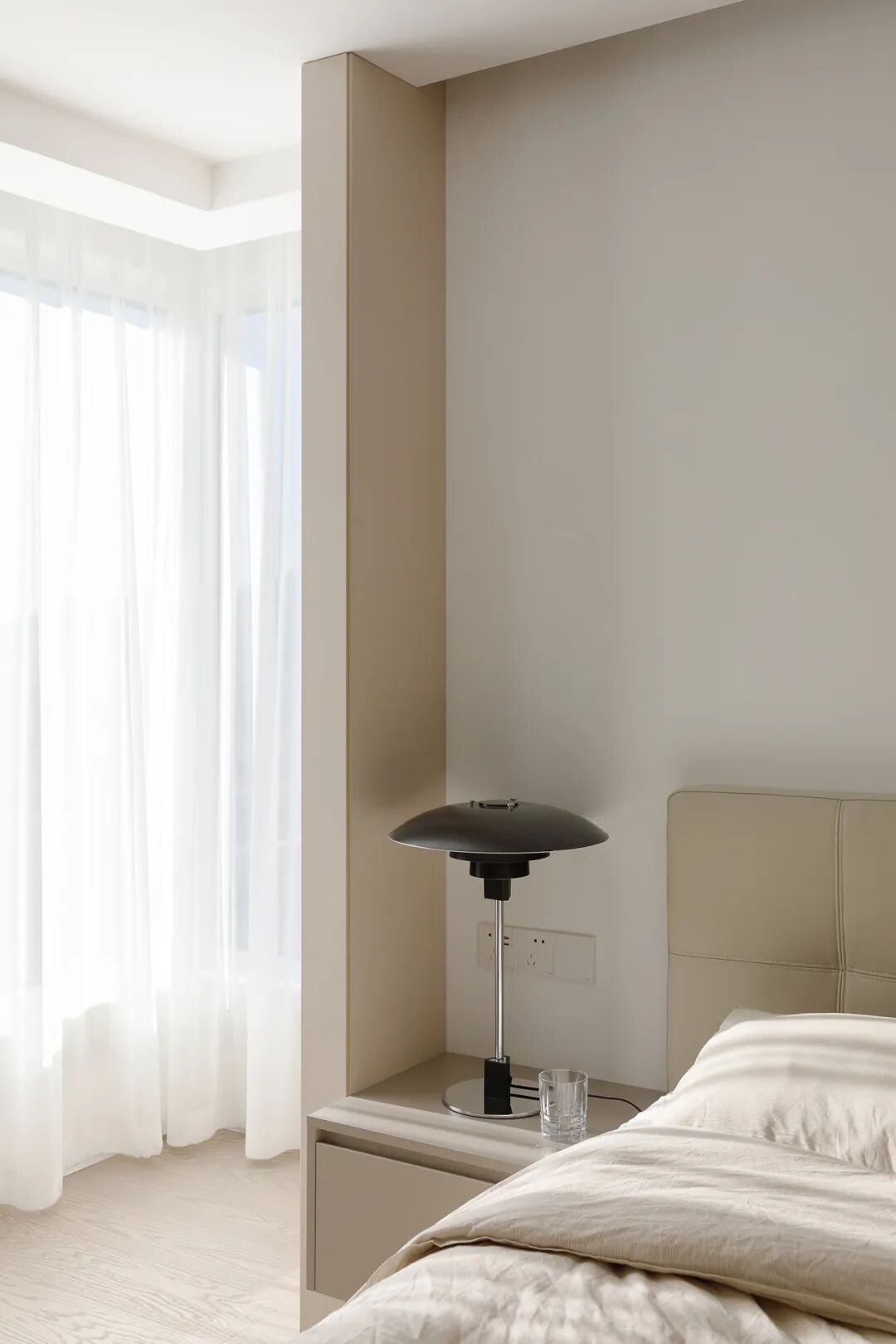 夫妇俩期待舒缓、安静的睡眠氛围。主卧这面L形窗户,阳光太过于明媚强烈。我们在靠近床头处延伸了墙面,帮助挡光。