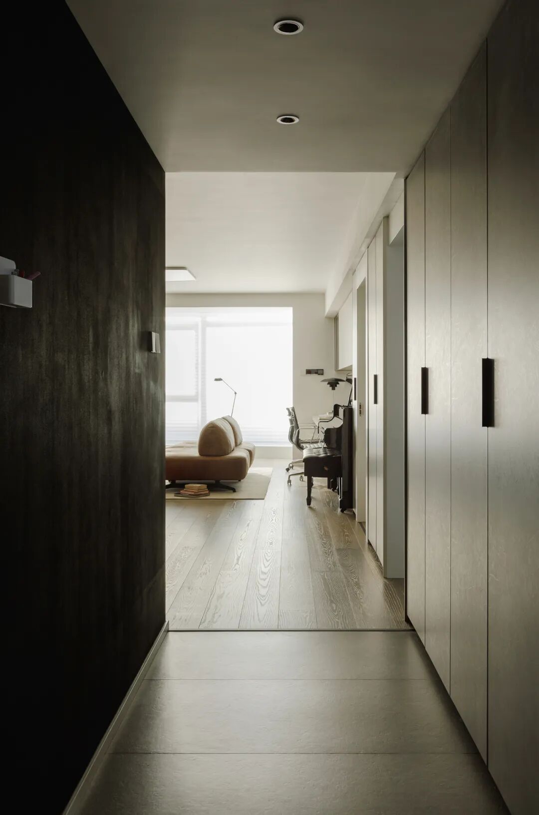 回头再来看门厅,是因为除去起居室,其他生活空间(中厨、卧室、客卫、设备间)都被门后这条走廊串联着。