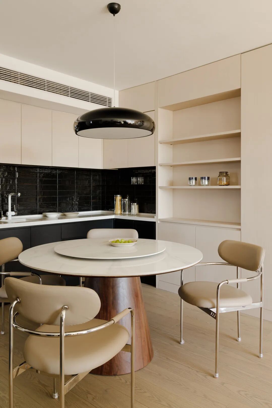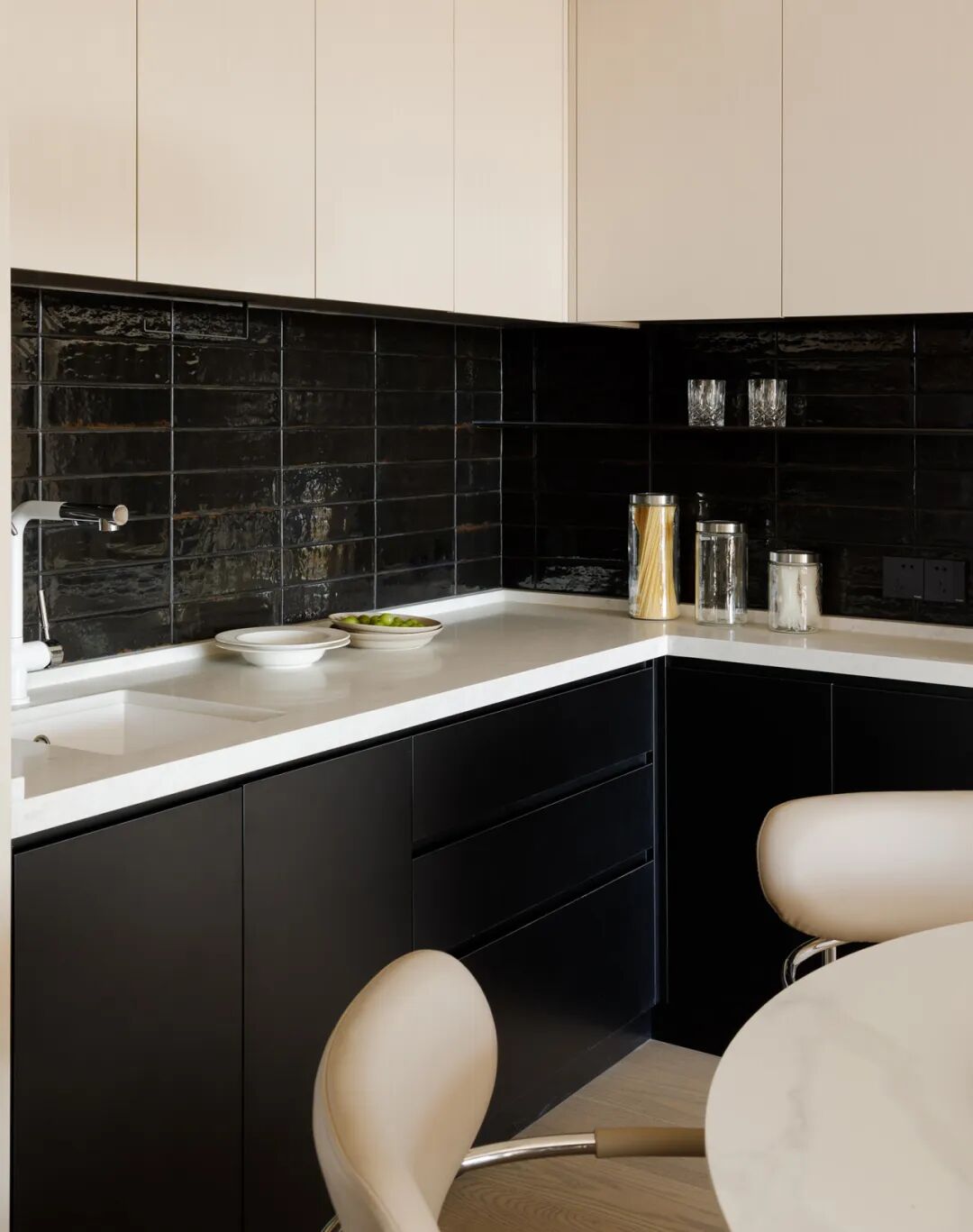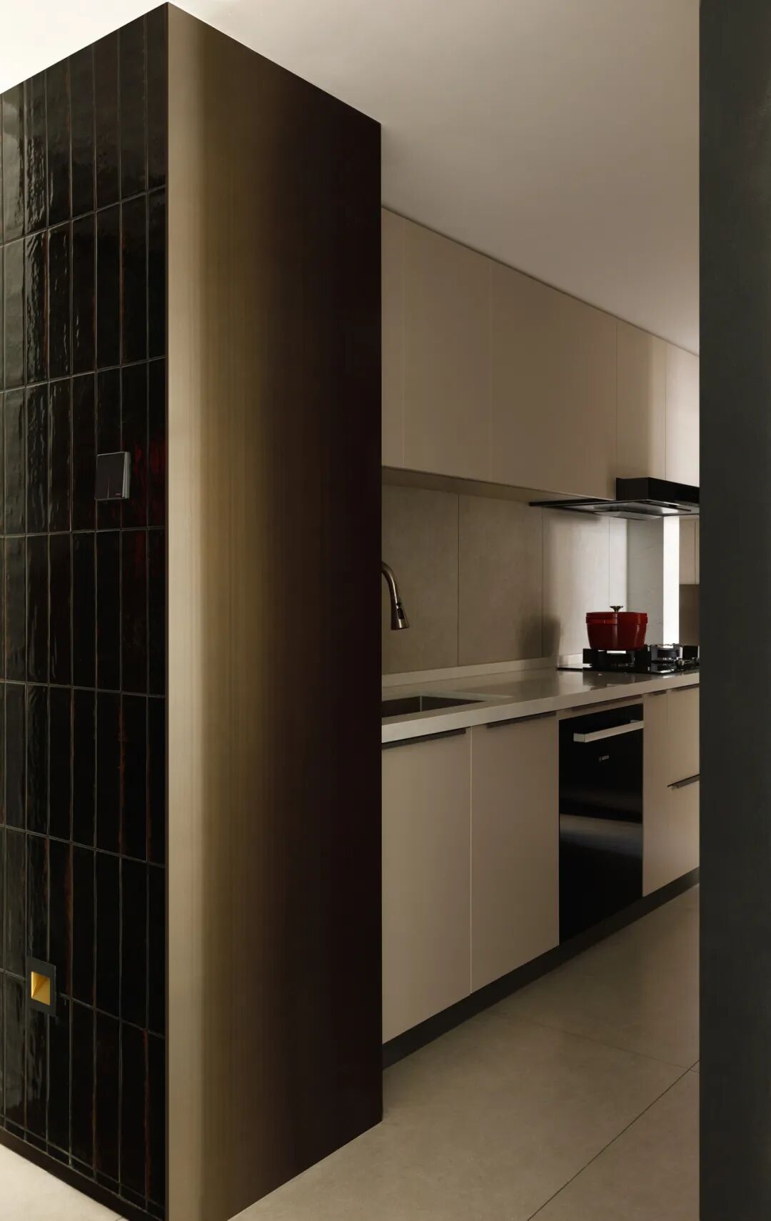 我们和Ms.L讨论过:“家的底色是舒缓温柔的,也会因小朋友们,多些艺术的、活泼的亮点。”她和先生爱喝茶、做烘焙。为方便使用,餐厅与西厨一体设计。补充有操作台、水槽,并将饮水机、烤箱、厨具美观收纳。这样聚着面包香气、欢声笑语的‘角落’,正需情调。黑色瓷砖即作为浪漫意象引入,波光粼粼,很梦幻~