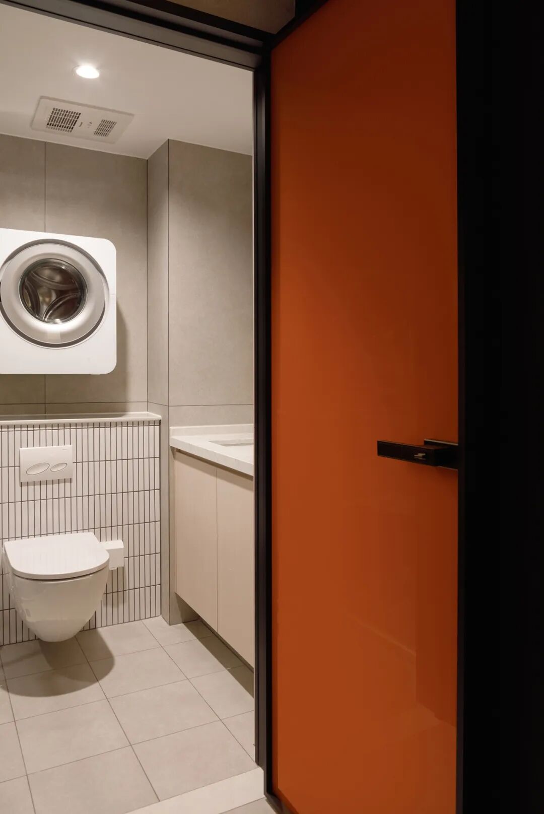 孩子们使用客卫,功能一应俱全。跳脱的橘色玻璃门表面是一层烤漆,能用粉笔绘画留言。