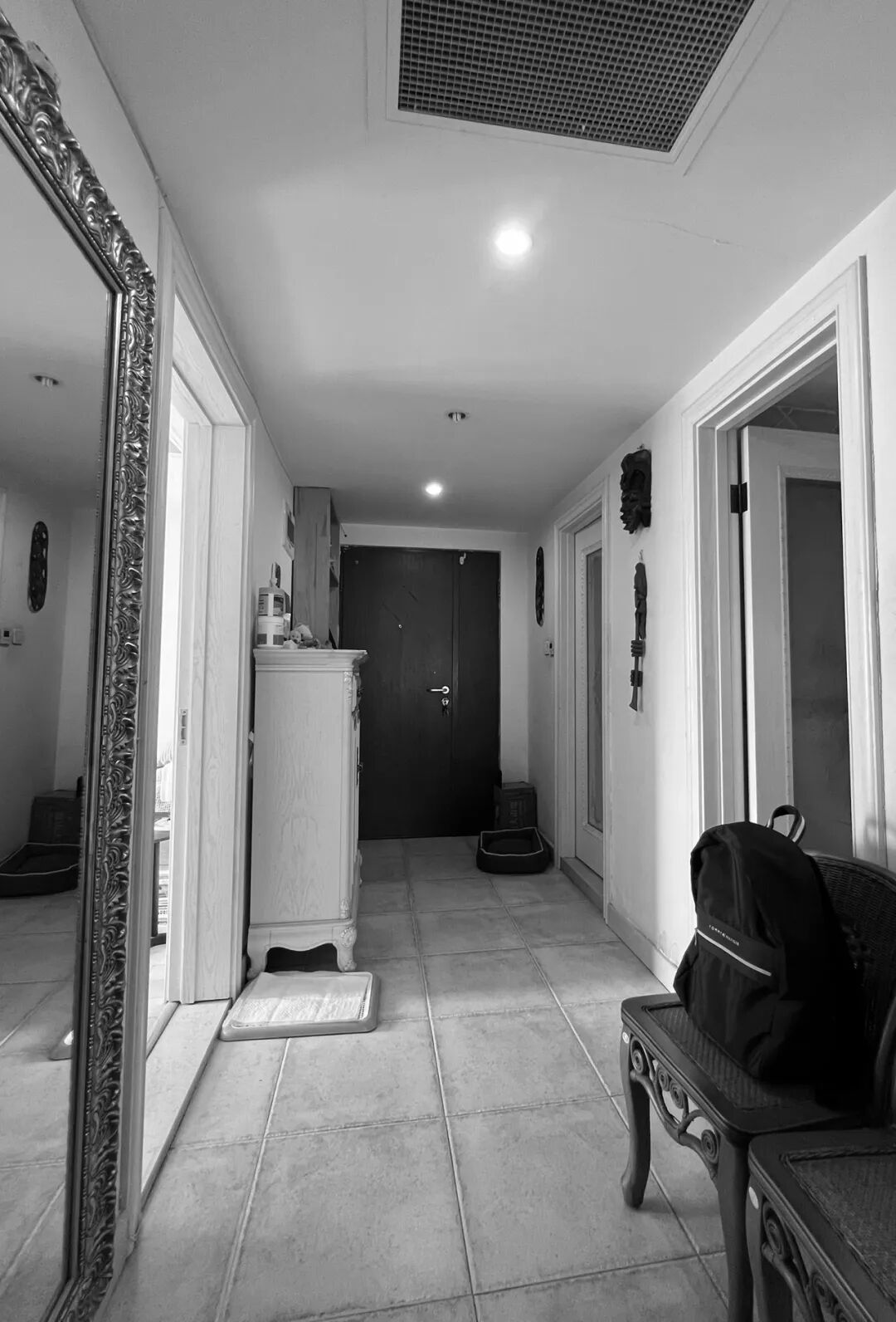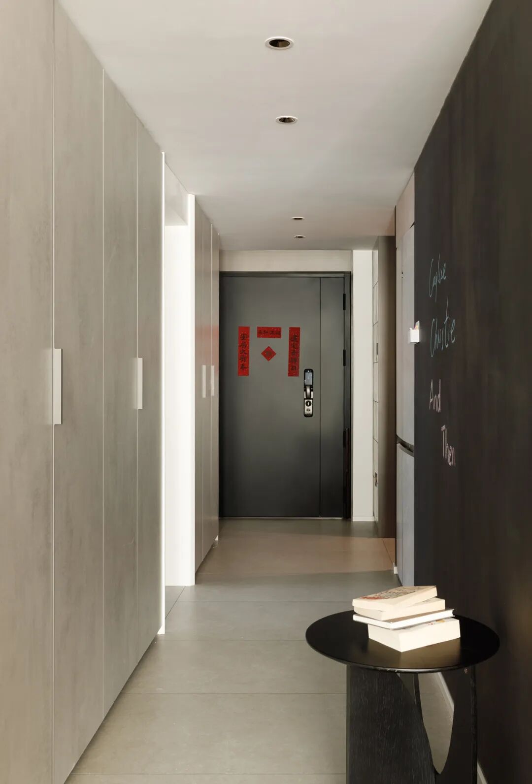走廊初始条件并不好。房间门太多显乱,缺少入户收纳